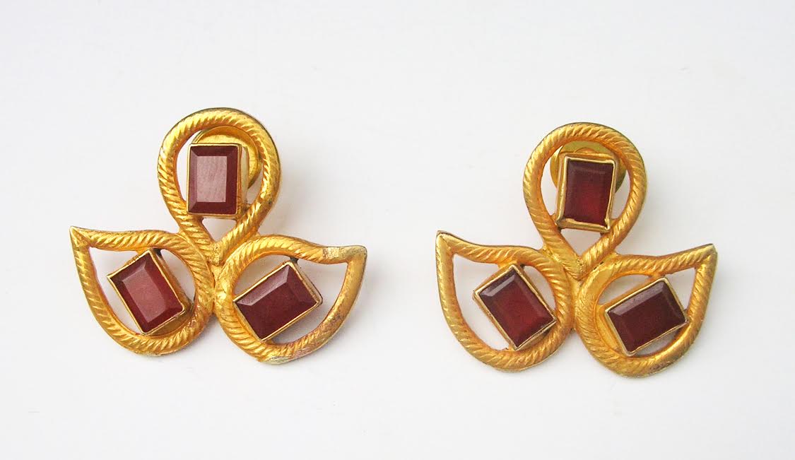 Exquisite gold earrings adorned with textured loops and vibrant red gemstones, radiating timeless elegance.