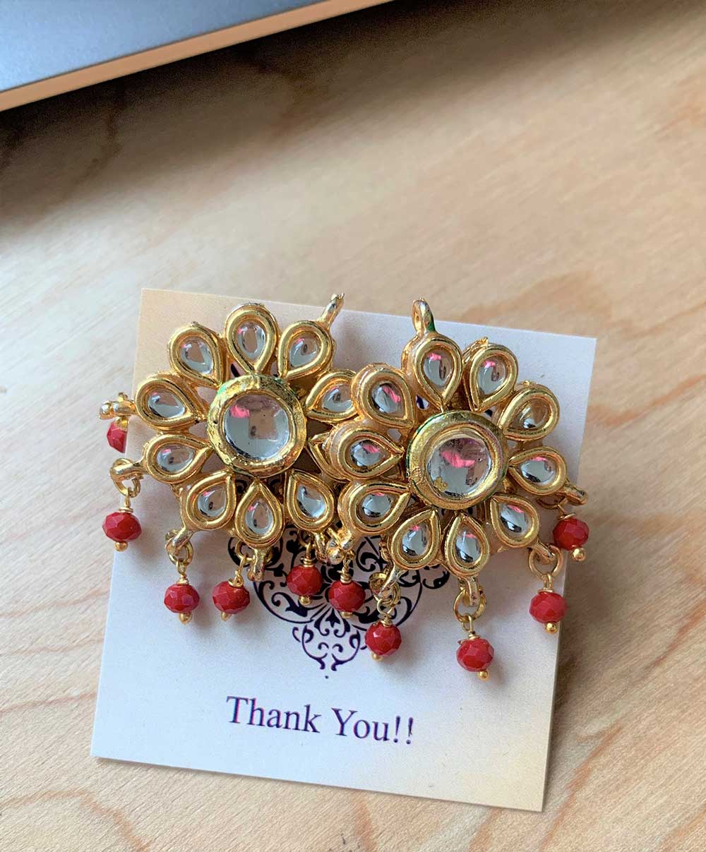Gold floral earrings adorned with clear gemstones and vibrant red beads, blending intricate artistry and classic charm.