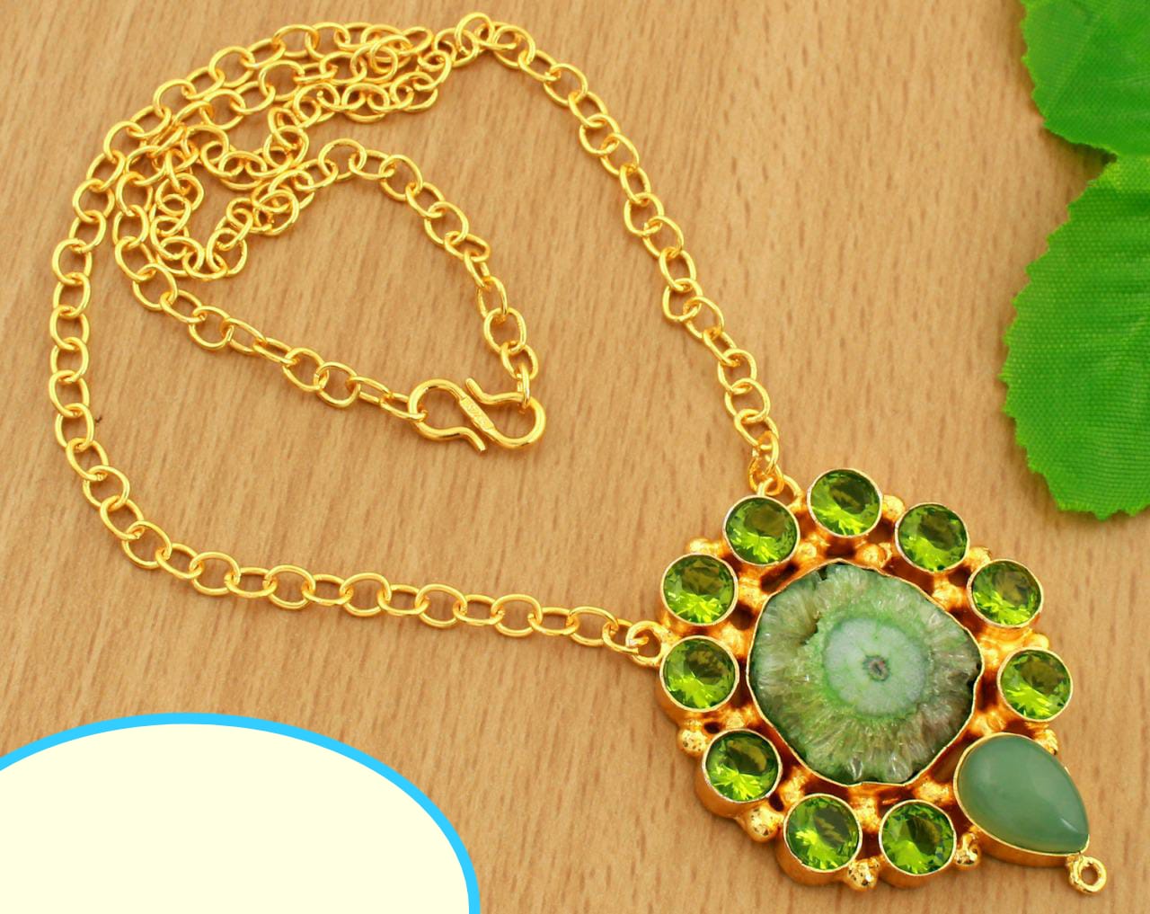 Gold accents adorned with luminous green stones and a teardrop bead-timeless elegance with vivid charm.