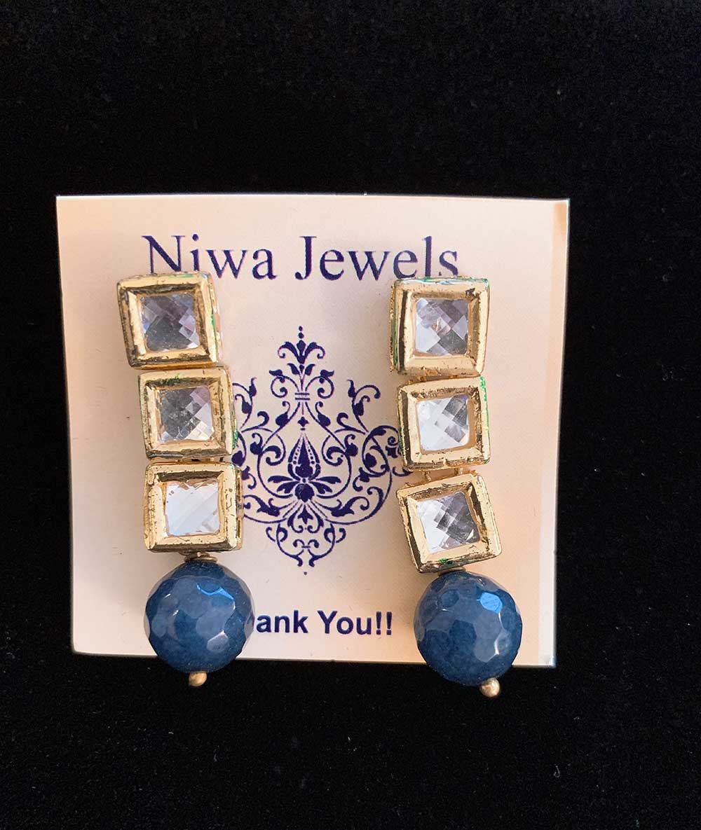 Clear square gemstones stacked in gold frames, finished with striking blue beads, exuding refined elegance.