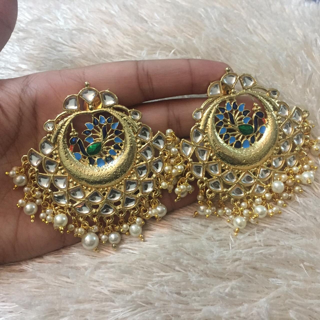 Embrace timeless elegance with these exquisite Peacock Kundan Chandbalis. Featuring intricate meenakari peacock motifs, crescent-shaped gold detailing, sparkling kundan stones, and pearl drops-these earrings are perfect for weddings, festivals, and traditional celebrations. A statement piece that radiates royal charm.