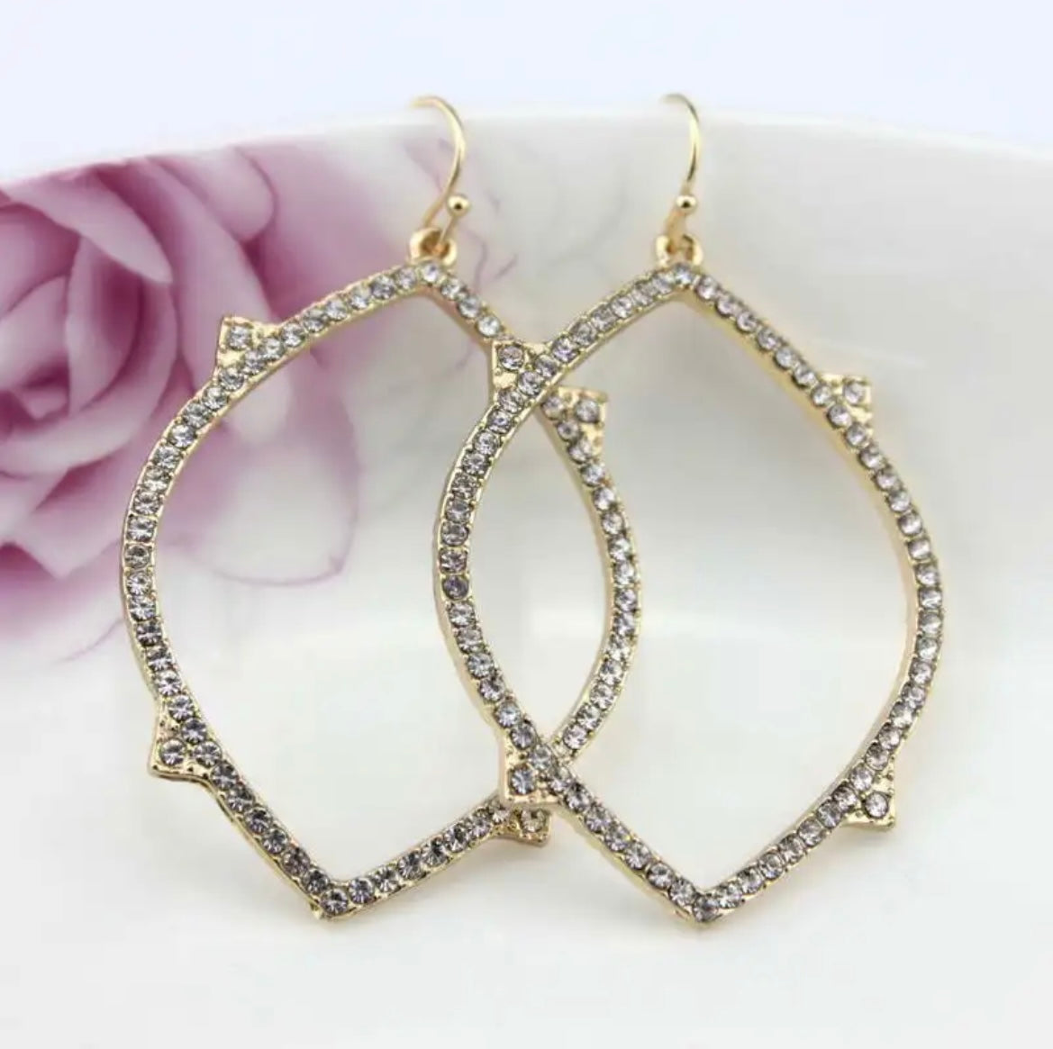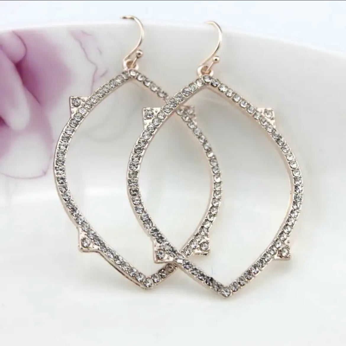 Marquis-shaped dangle earrings, features a slender, possibly metal, sparkling stones, likely cubic zirconia.