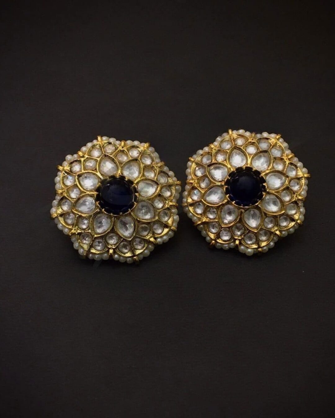 A luxurious pair of floral-patterned earrings featuring a central deep blue gemstone surrounded by sparkling white stones, set in gold-tone metal for an opulent touch.