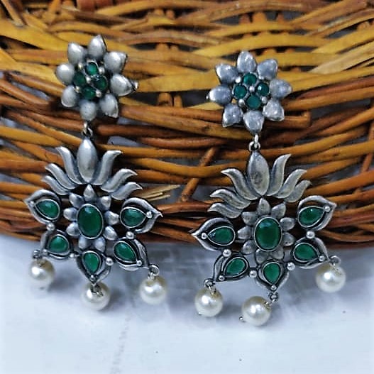 Elegant silver floral earrings with vivid green stones and graceful pearl drops, blending charm and sophistication effortlessly.