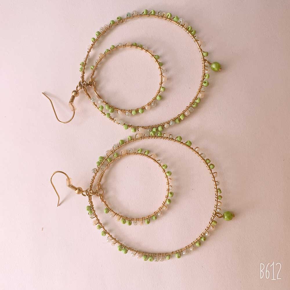Golden hoop earrings intricately wrapped with green and white beads-delicately colorful and stylish.