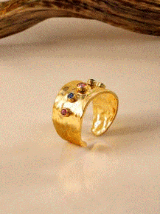 Gold-toned ring with a hammered texture, adorned with luminous pink, blue, and black gemstones-bold yet elegant.