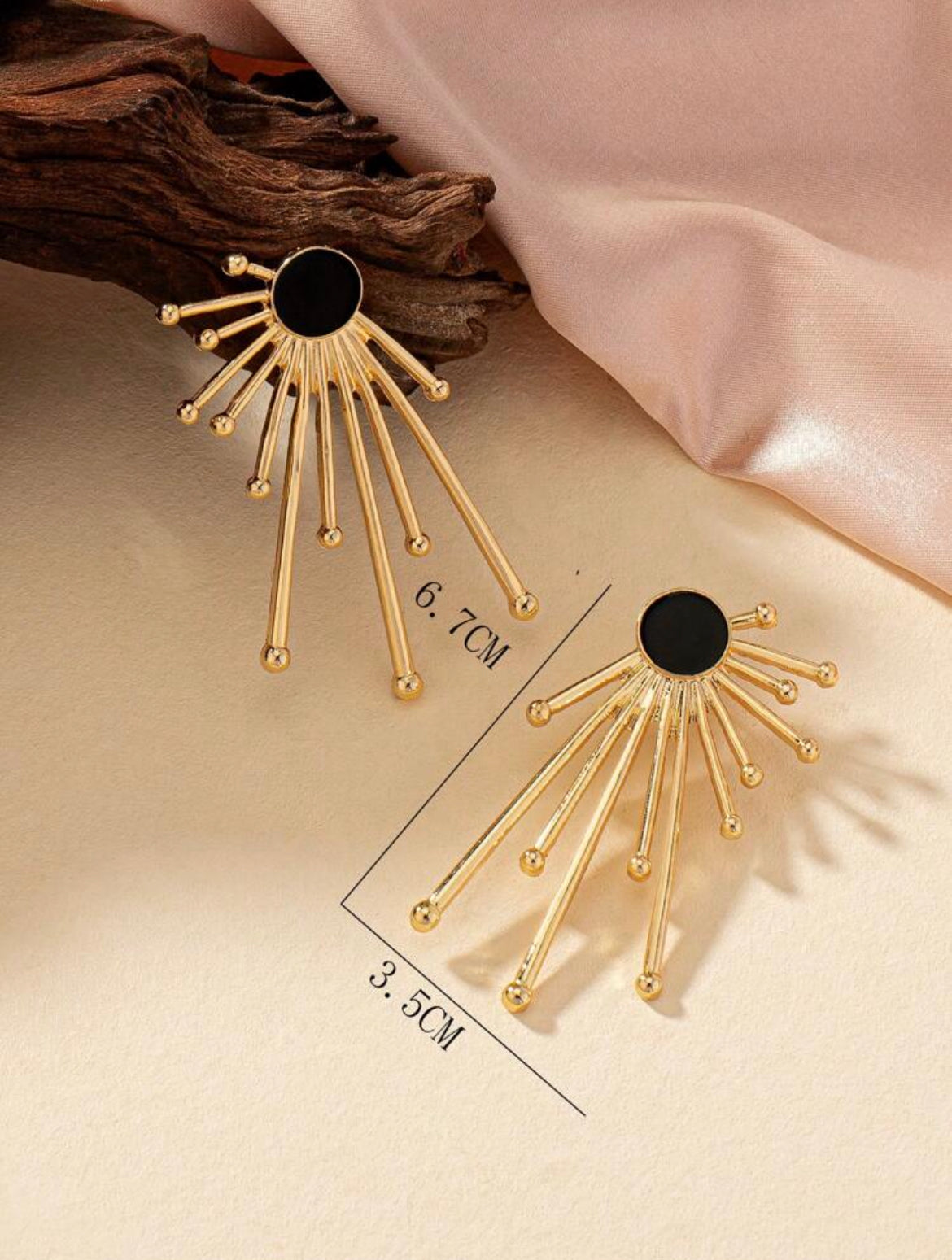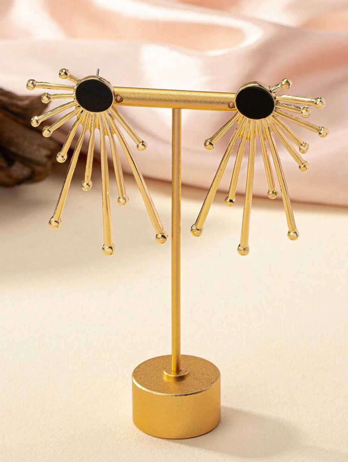 The earrings featuring a circular black stud with radiating spikes, sunray design, gold-plated metal.