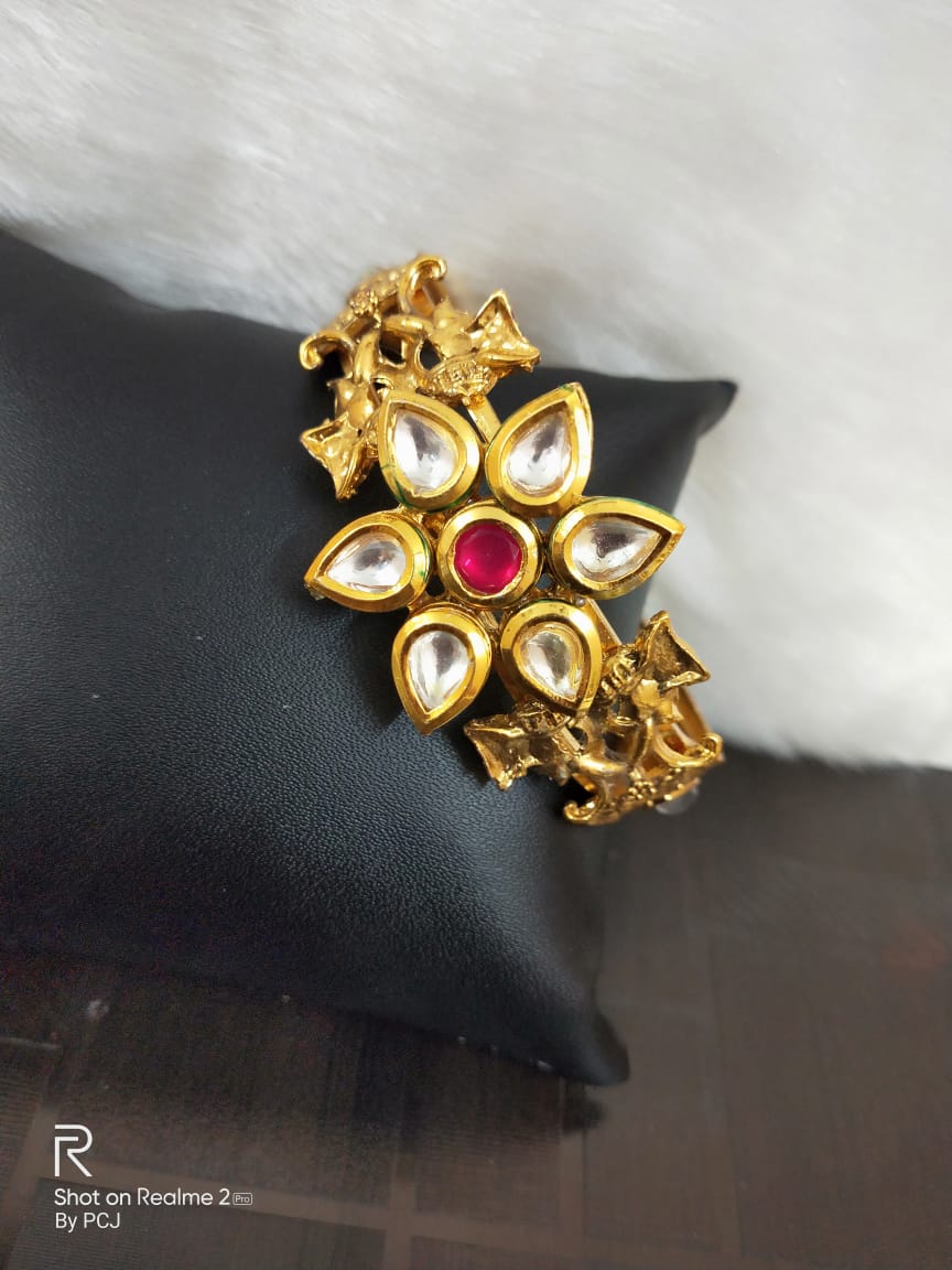 A gold bracelet featuring a central floral motif with white teardrop stones encircling a vibrant red gem-classic and refined.