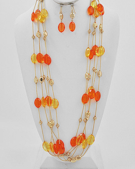 A sophisticated jewelry set featuring cascading gold strands adorned with warm-toned beads, paired with elegant matching drop earrings-radiant and refined.