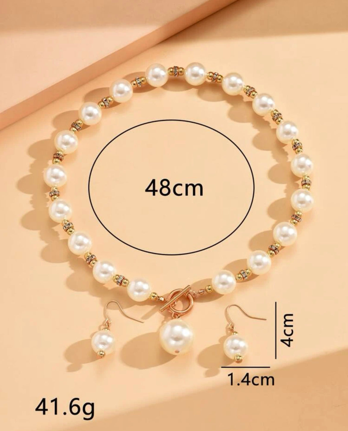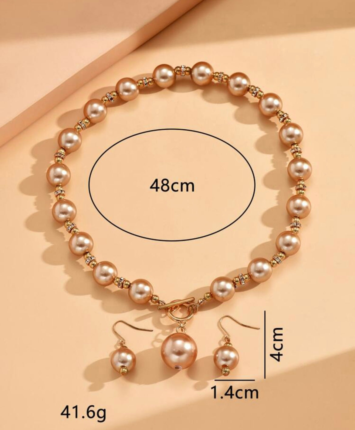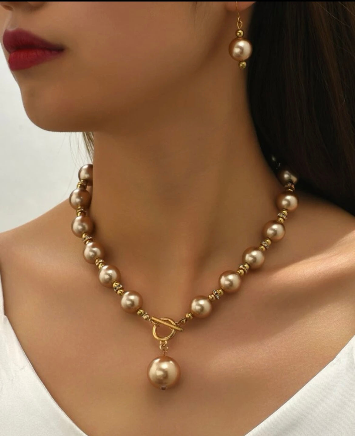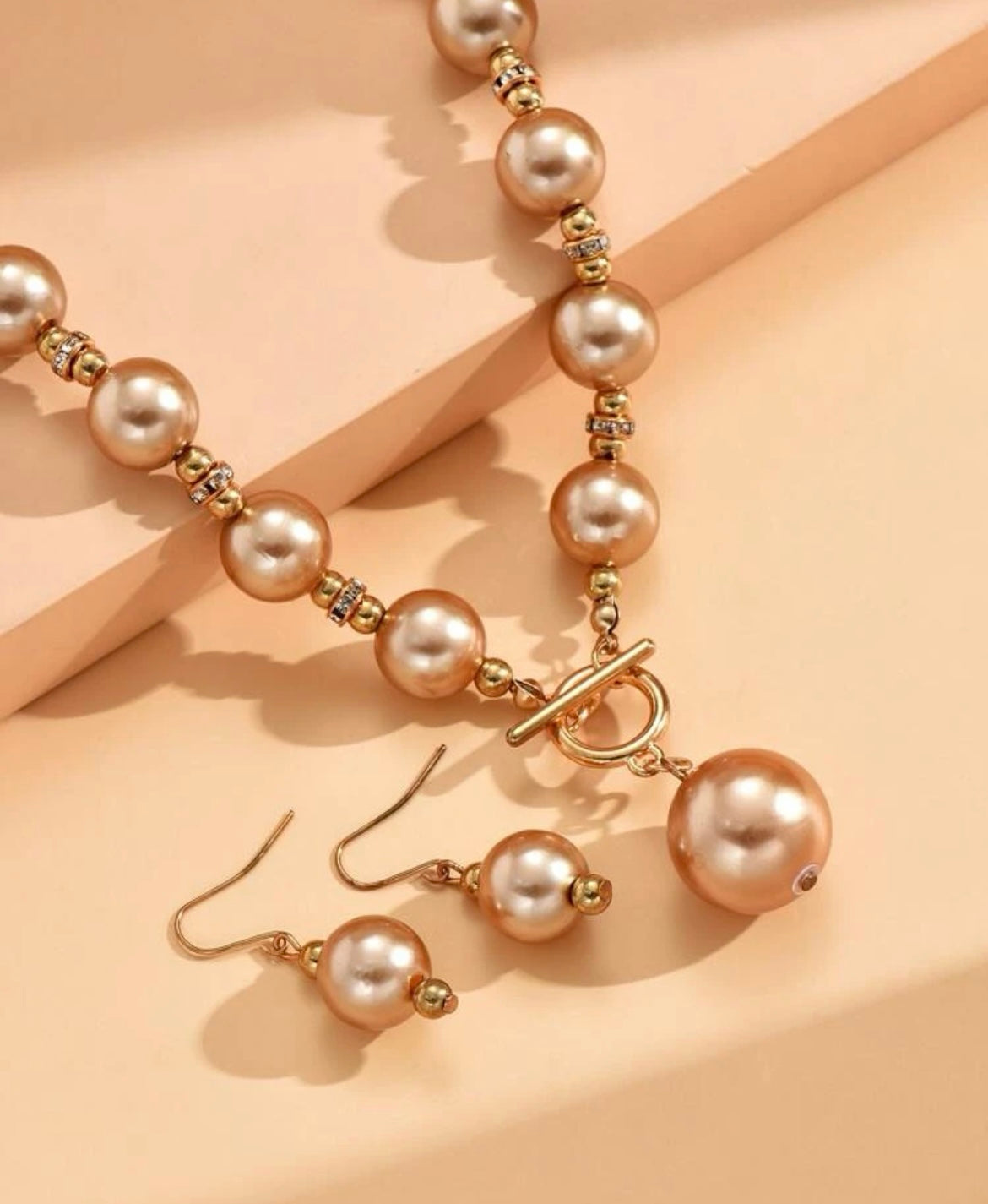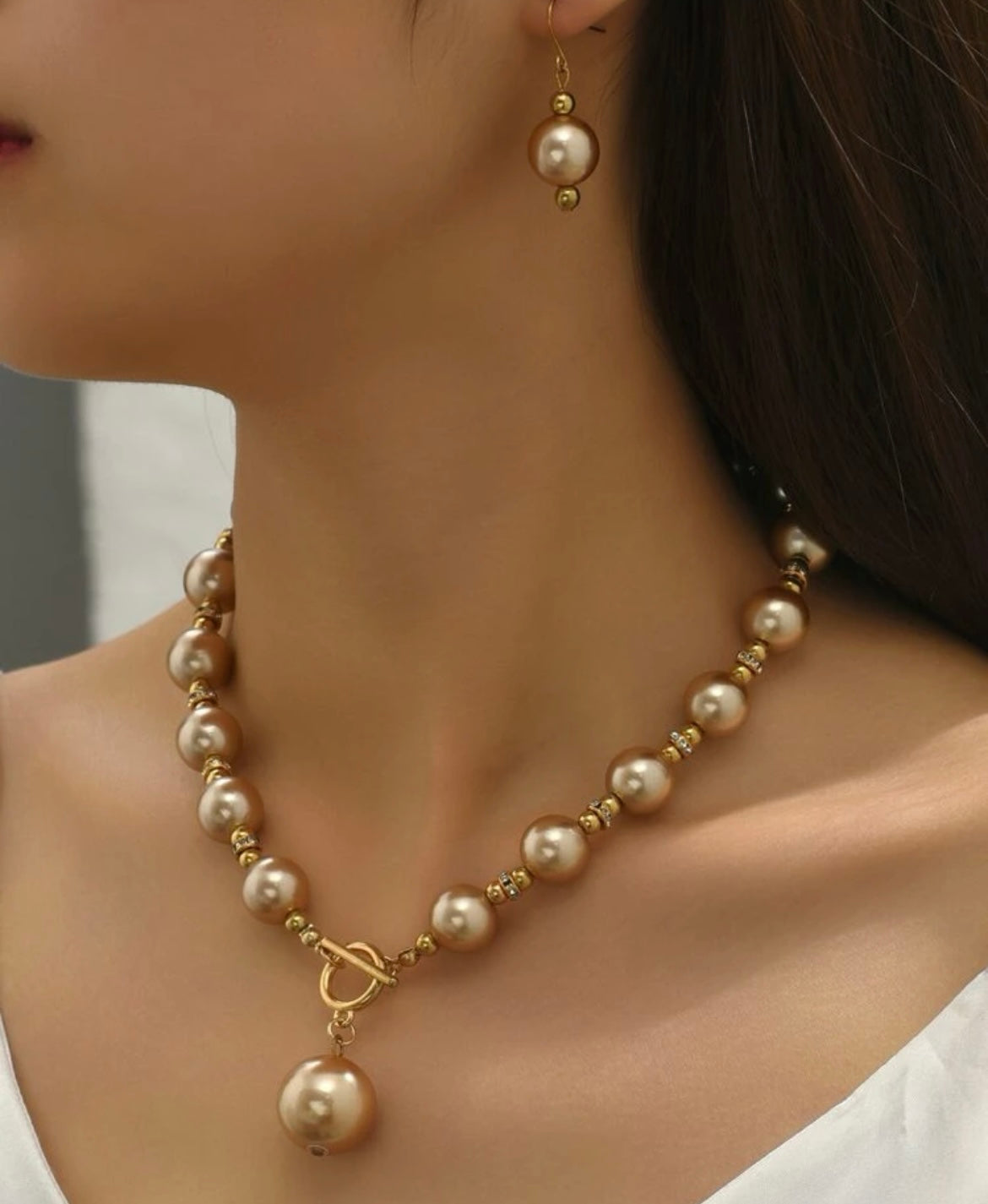 A refined golden pearl necklace with a toggle clasp and matching earrings, radiating timeless elegance and sophistication.
