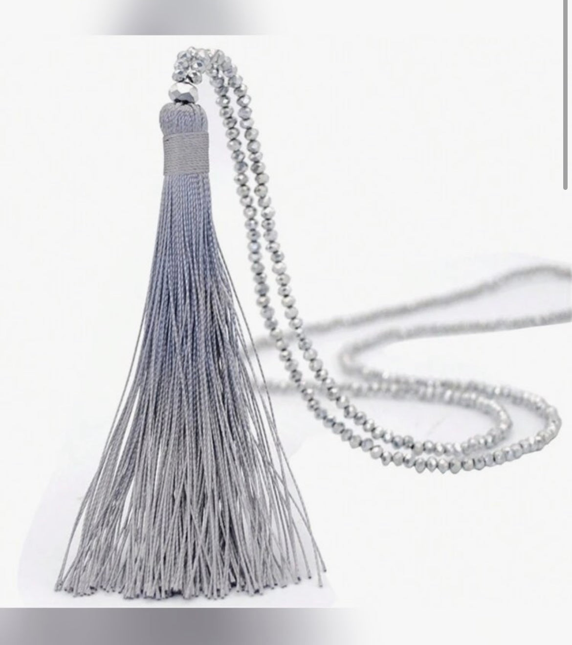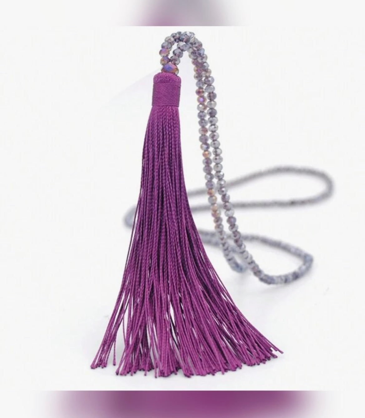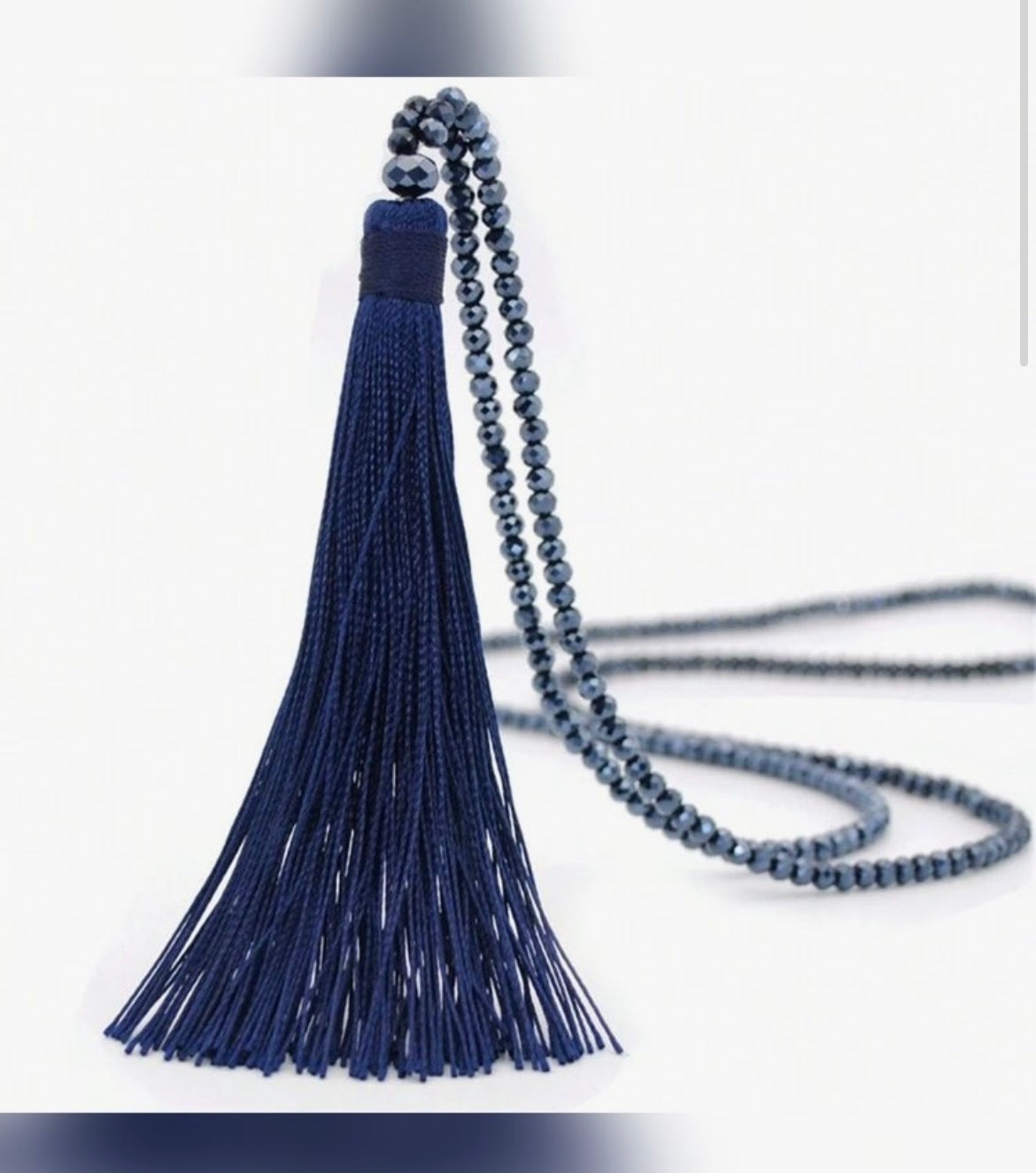 A long tassel necklaces, feautures a beaded chain and comes in a variety of colours.