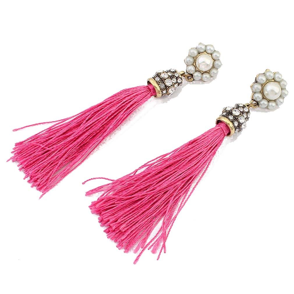 Soft pink tassels cascade beneath shimmering rhinestones, accented with pearls for a refined charm.
