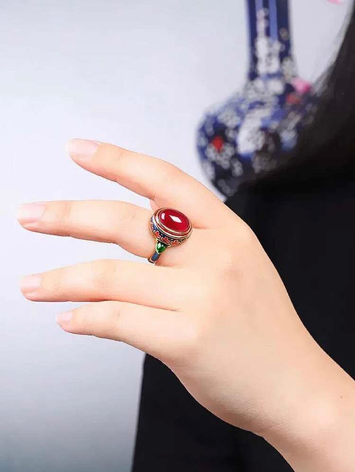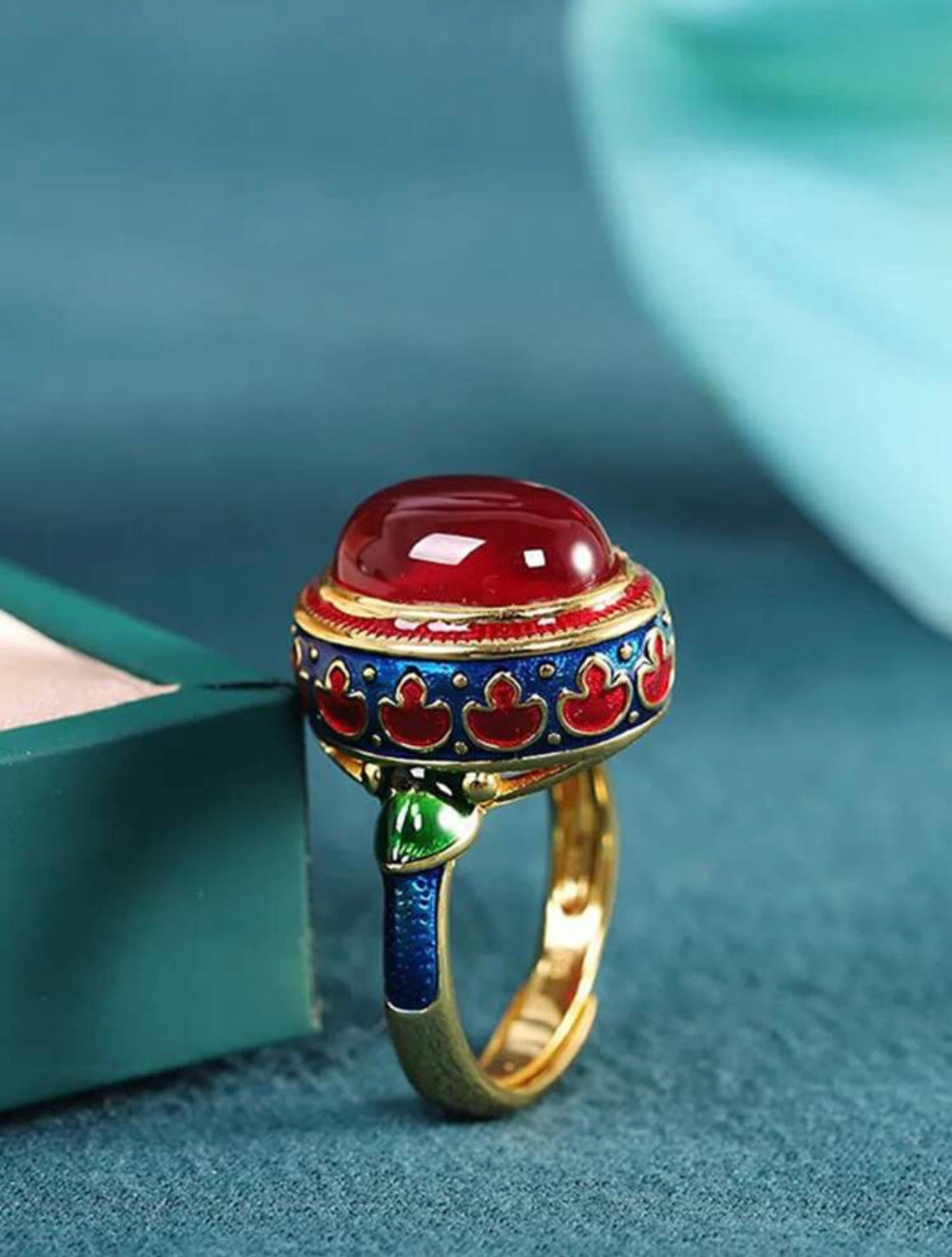 An ornate ring featuring a vivid red gemstone, a blue and gold band with heart motifs, and a delicate green stone accent-richly detailed and strikingly unique.