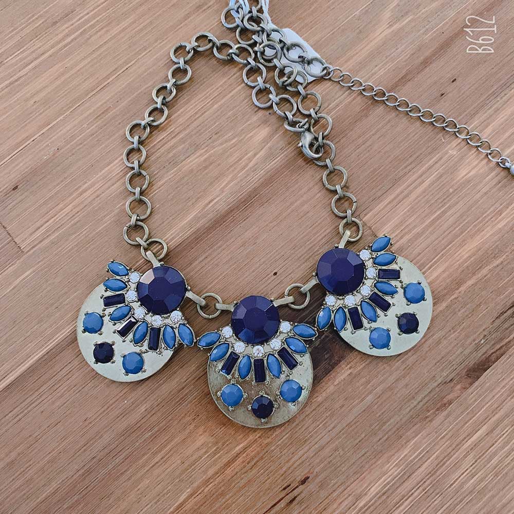 A gold chain necklace with three circular pendants, each featuring a deep blue gemstone encircled by radiant blue and white accents-strikingly intricate and regal.