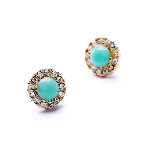 Elegant stud earrings featuring turquoise stones encircled by sparkling rhinestones in a gold-tone setting, exuding timeless charm.