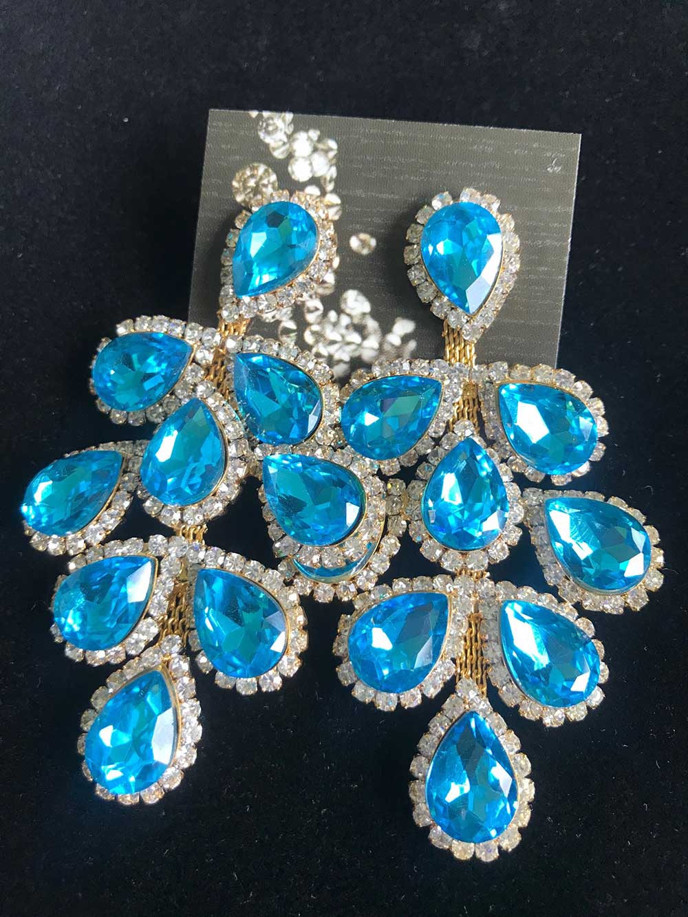 Elegant earrings with vibrant blue teardrop gemstones framed by sparkling clear stones, radiating timeless glamour.