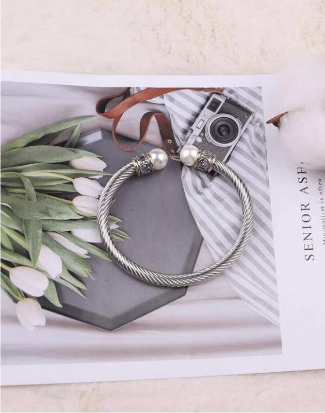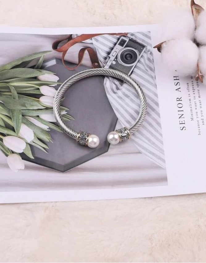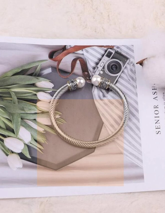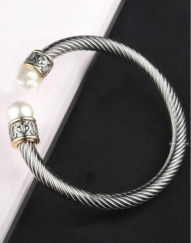 A twisted metal bracelet with dual-tone decorative caps and pearl accents-gracefully chic.