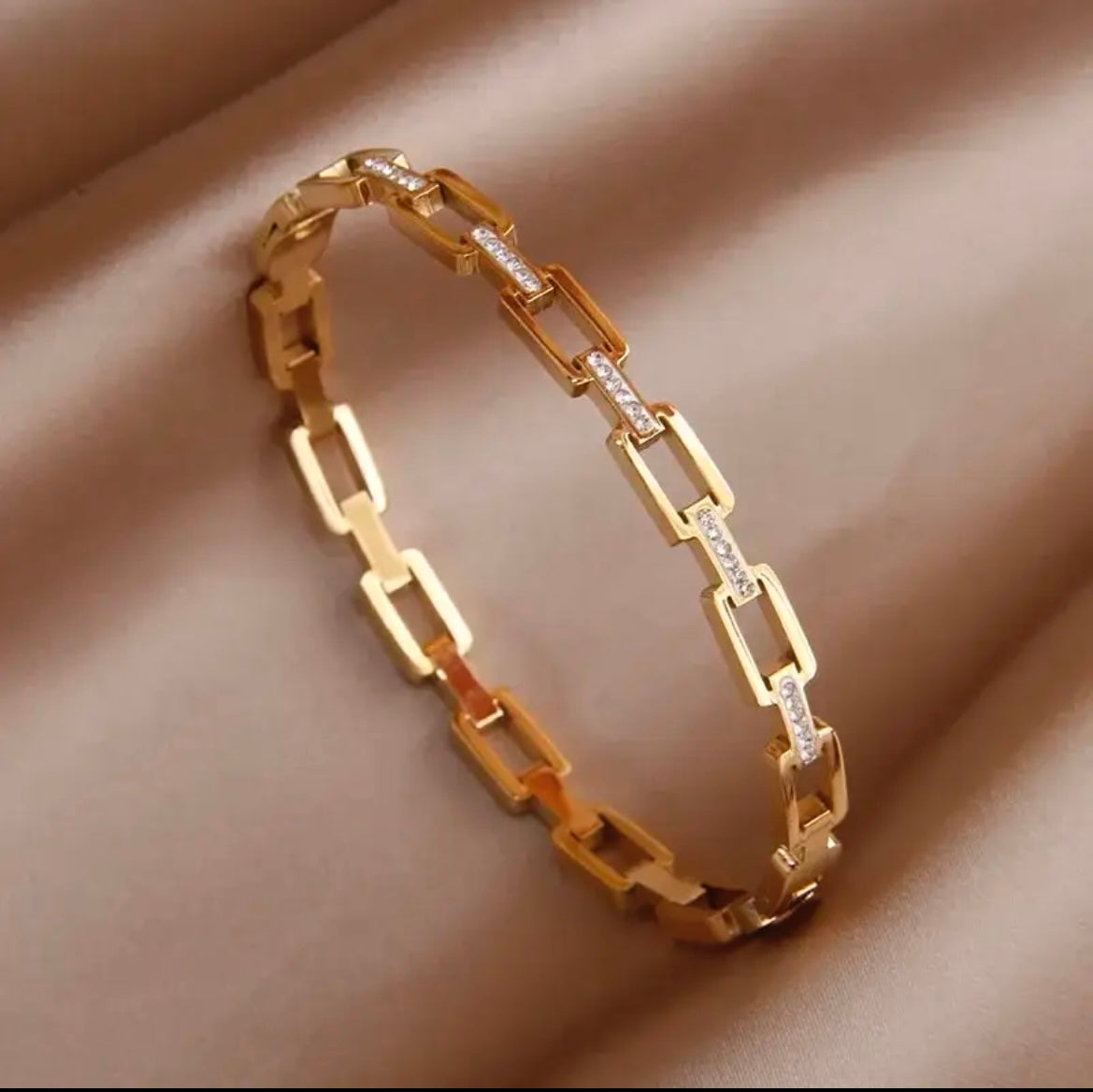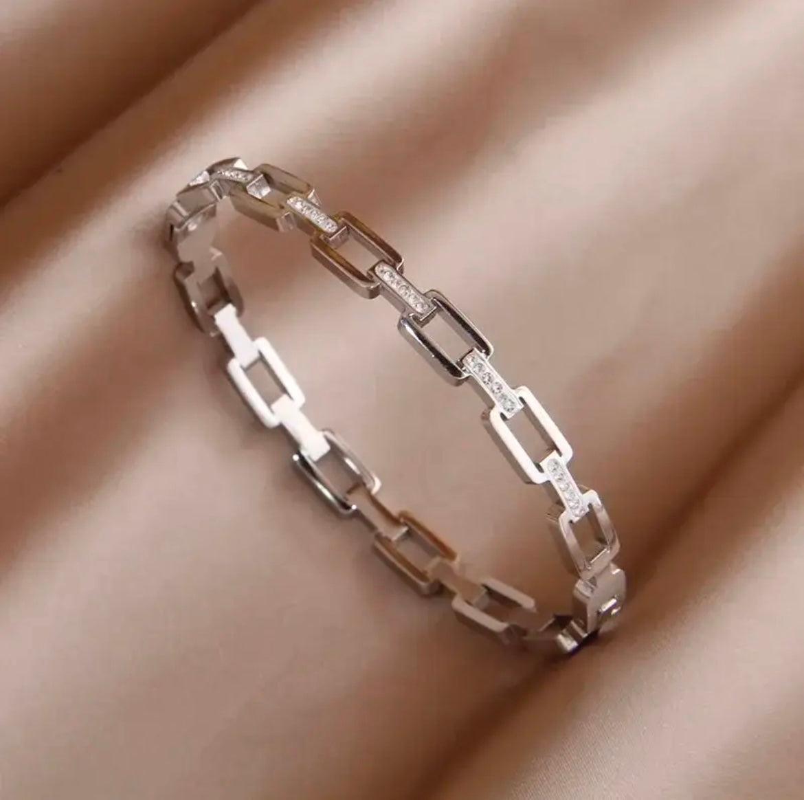 The bracelet is a chain-link style and has a hook-in snap-shut clasp.