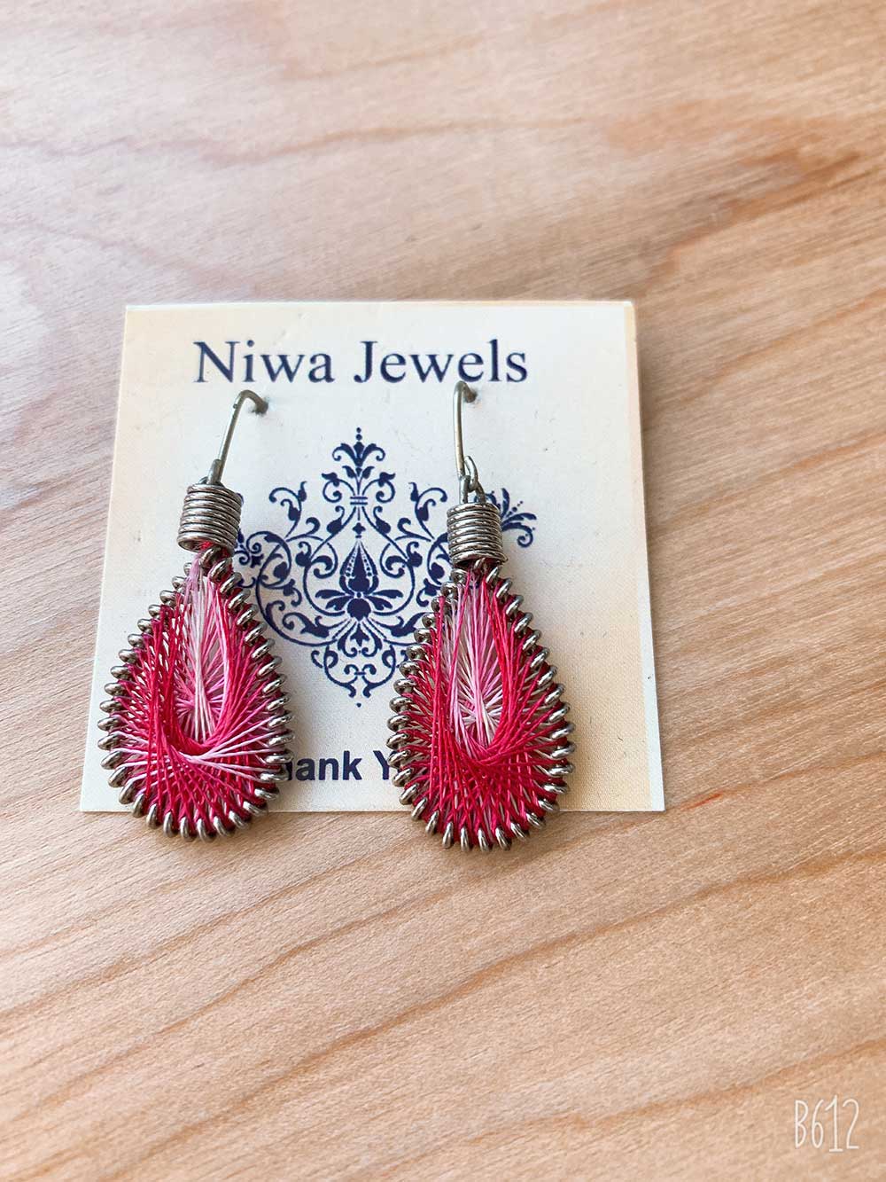 A graceful pair of teardrop earrings adorned with vibrant red and pink threadwork, exuding timeless charm.