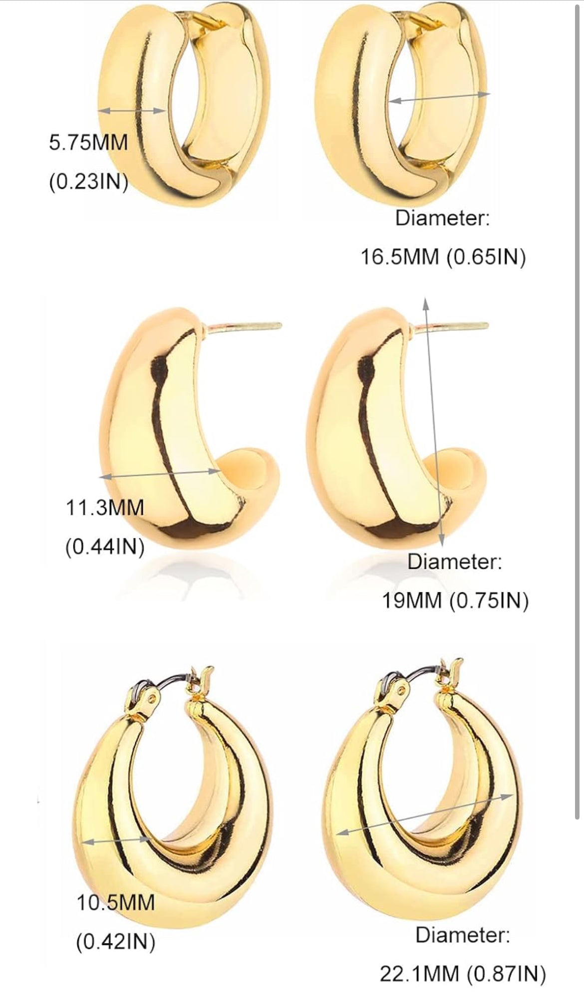 A timeless trio of gold-plated chunky hoop earrings, perfect for adding subtle sophistication to any outfit. Their smooth, polished finish offers a luxurious touch for both casual and dressy looks.