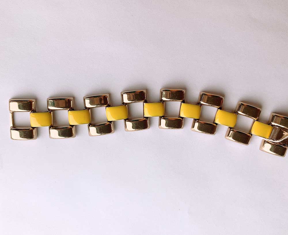 A bracelet featuring alternating yellow and metallic square links, offering a bold yet refined aesthetic.