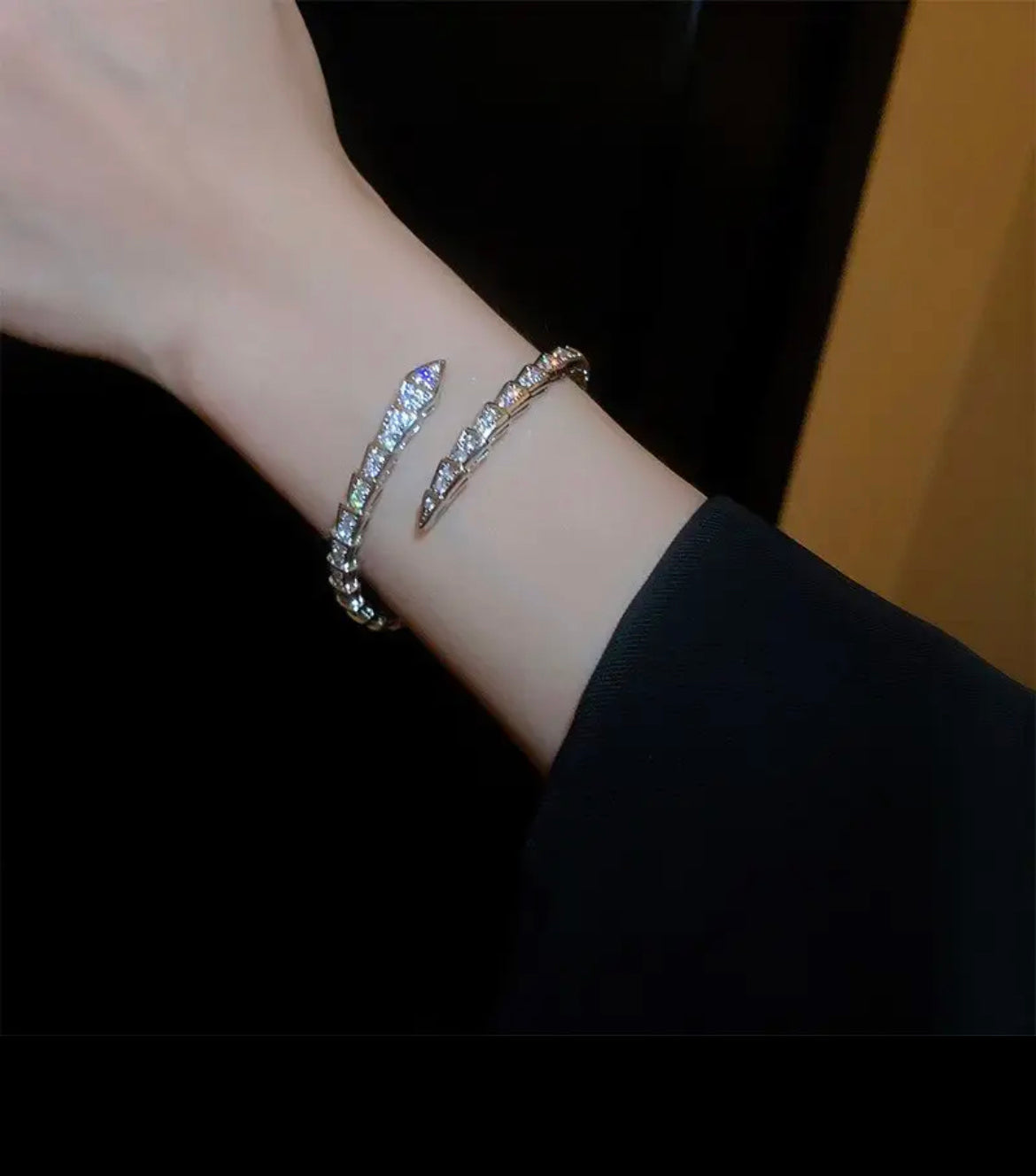 Cubic zirconia silver snake bone bangle, shiny appearance, adjustable and silver-plated finish.