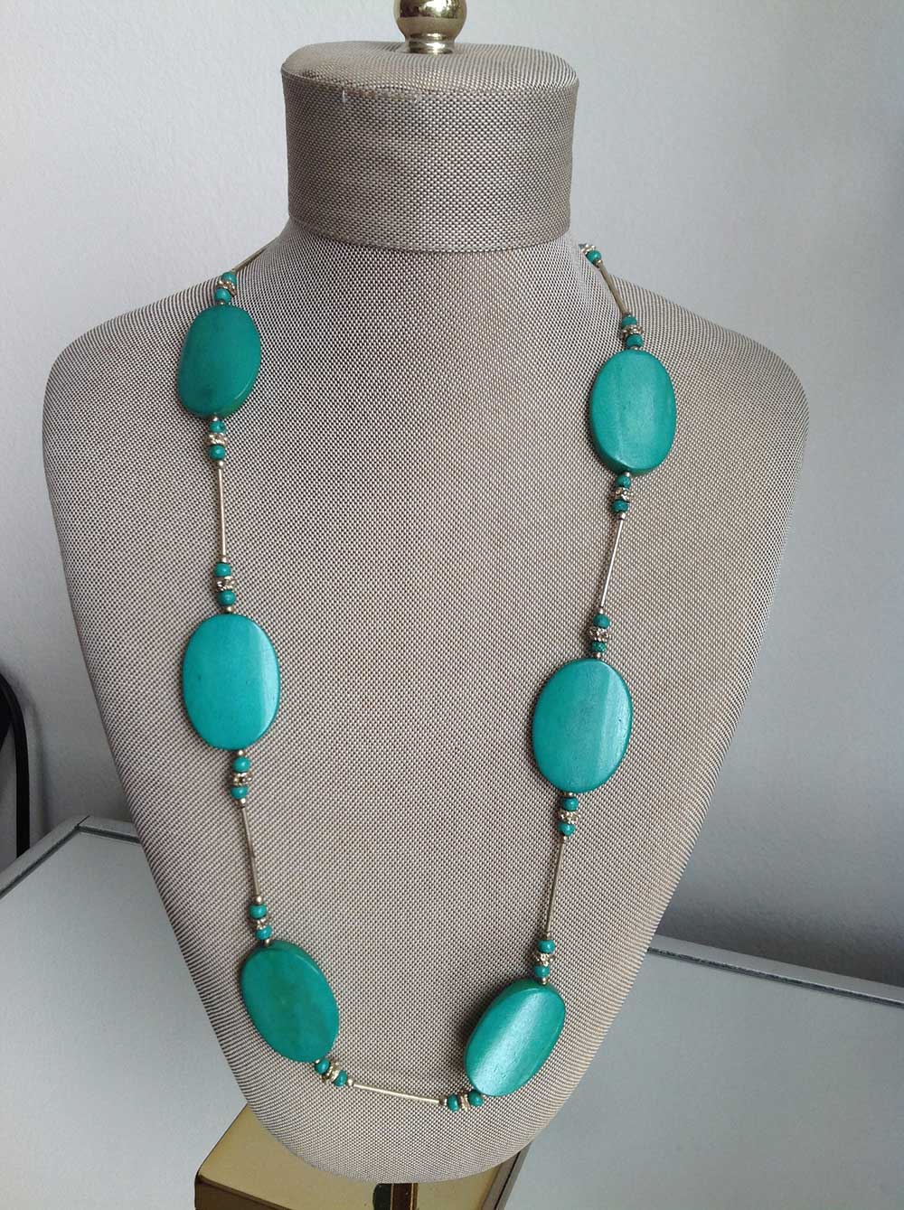 Turquoise beads with metallic spacers form a vibrant and balanced design-striking and sophisticated.