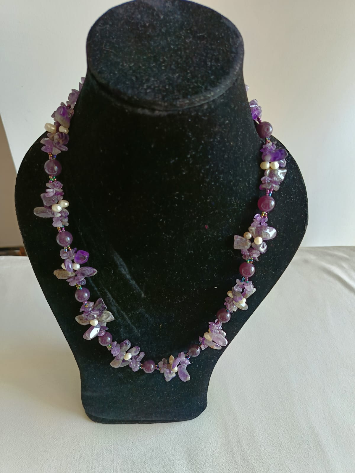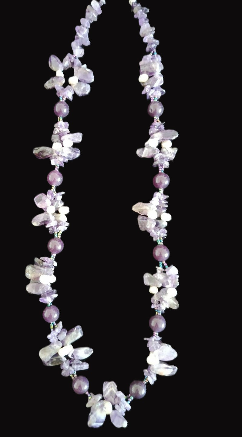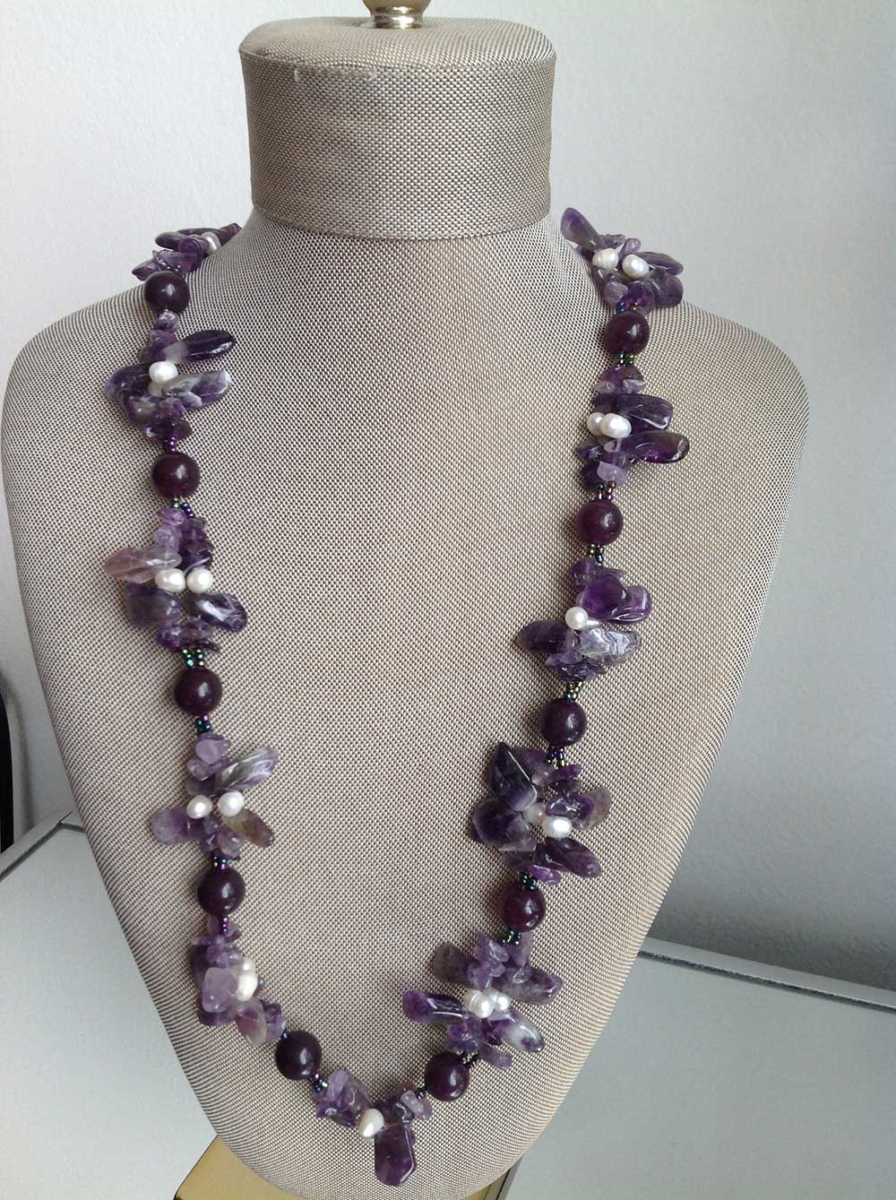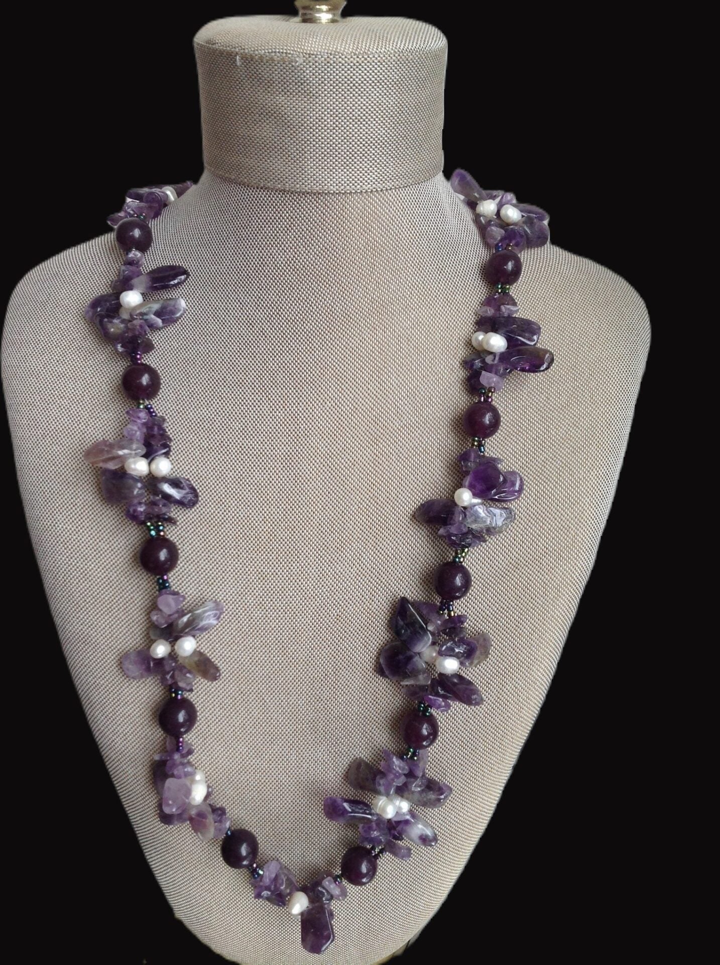 Dark purple beads and clustered amethyst stones accented with white pearls-richly graceful and refined.
