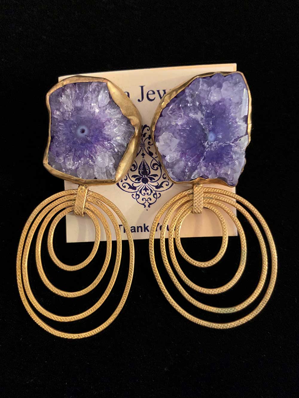 Earrings featuring large purple geode stones set in gold with concentric gold oval loops, blending bold vibrancy with intricate design.