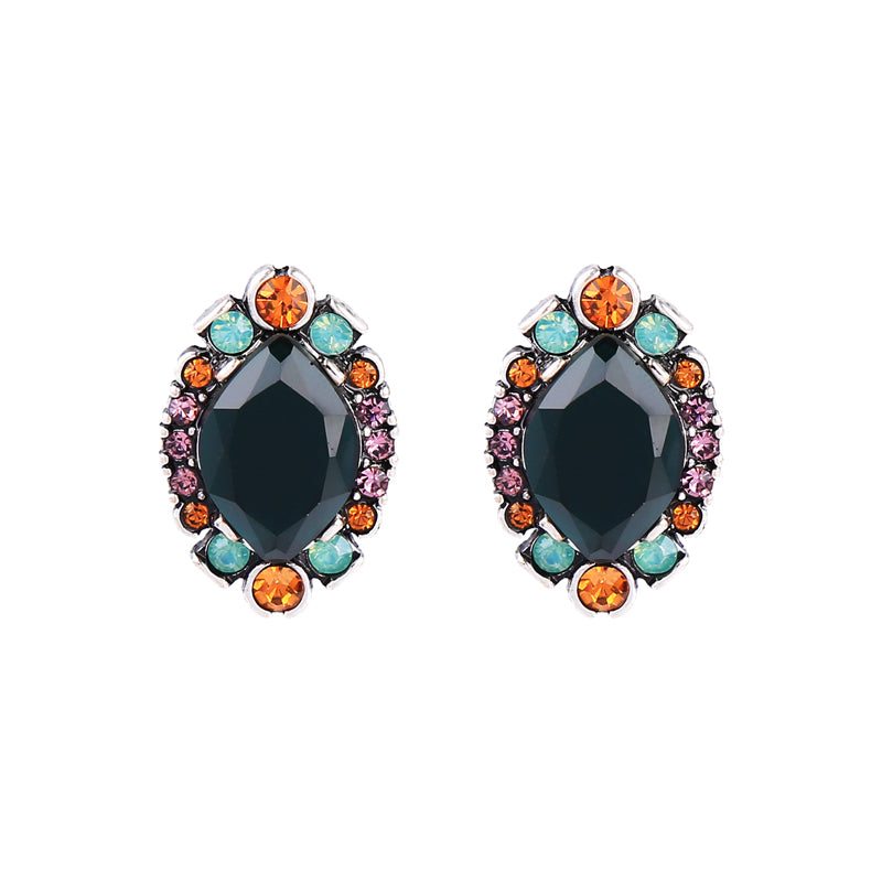 Elegant earrings featuring a dark central stone encircled by vibrant gems in orange, turquoise, and pink hues, creating a captivating statement.