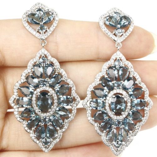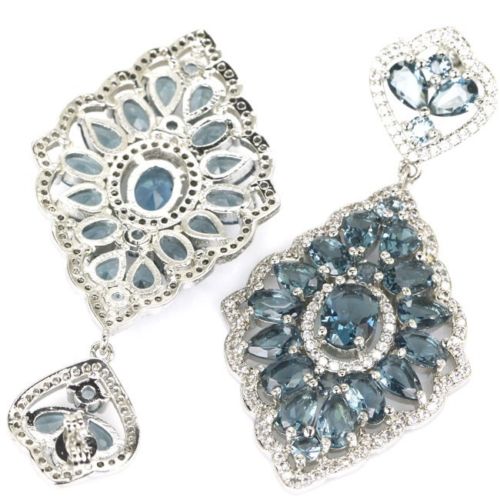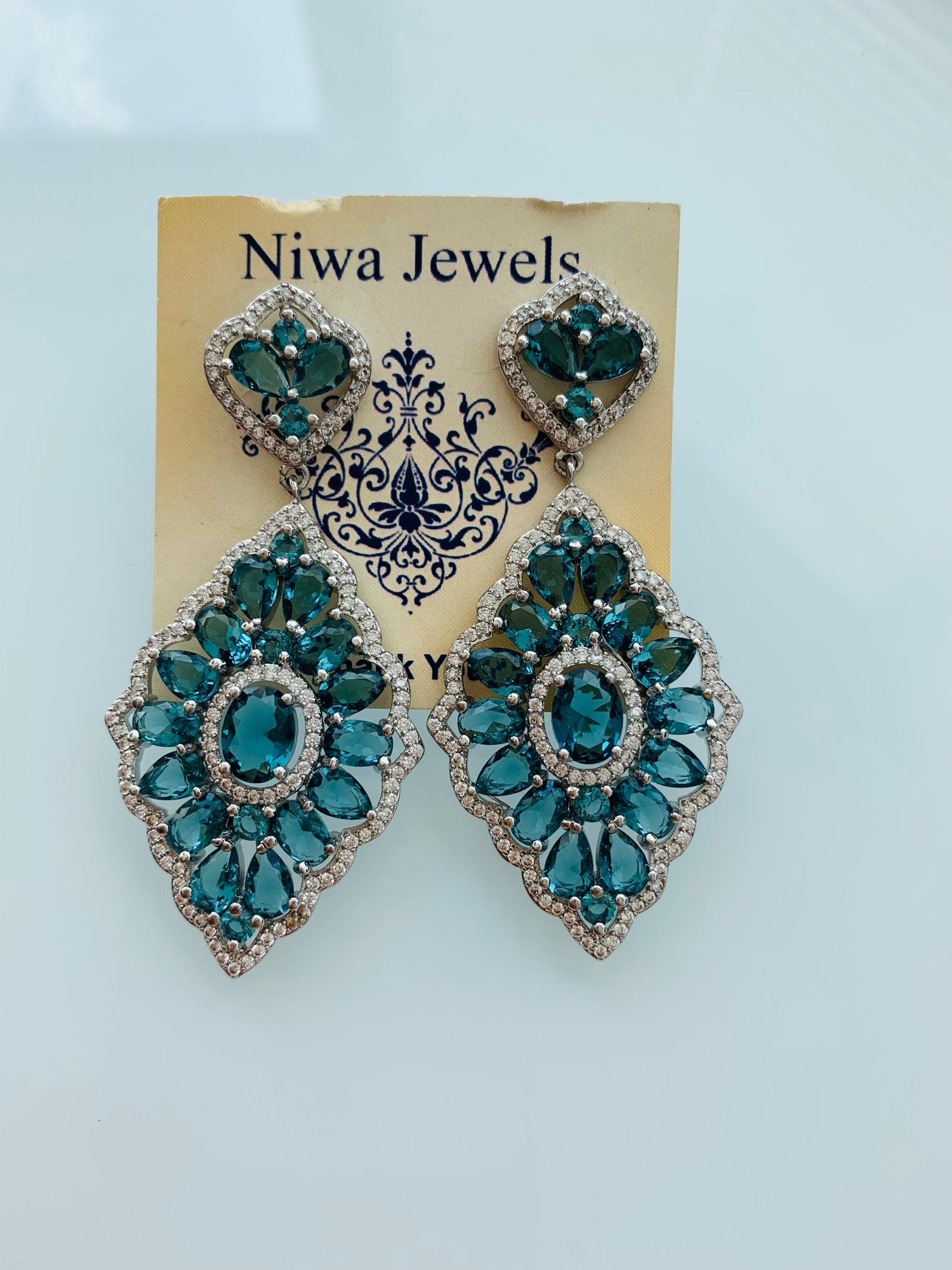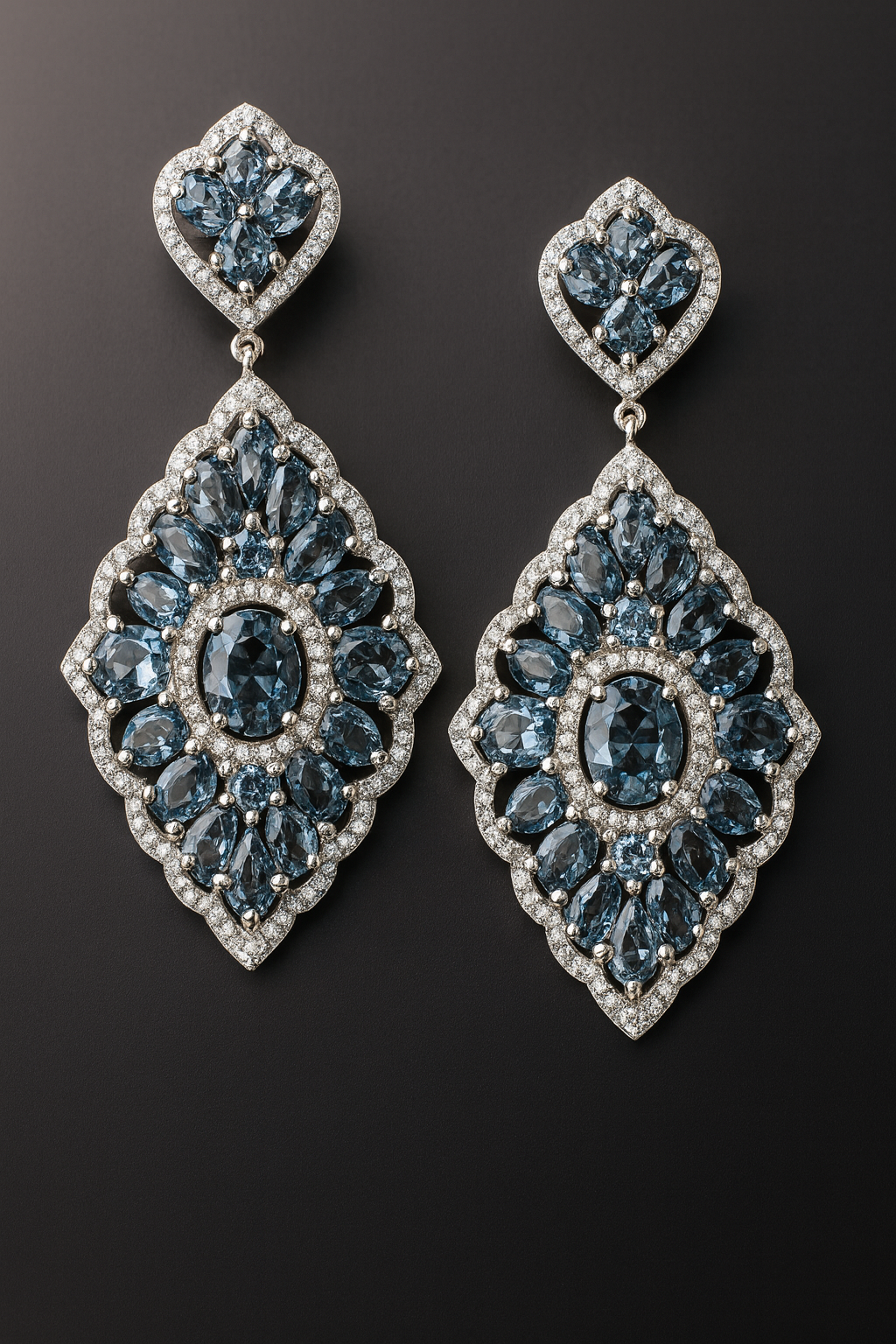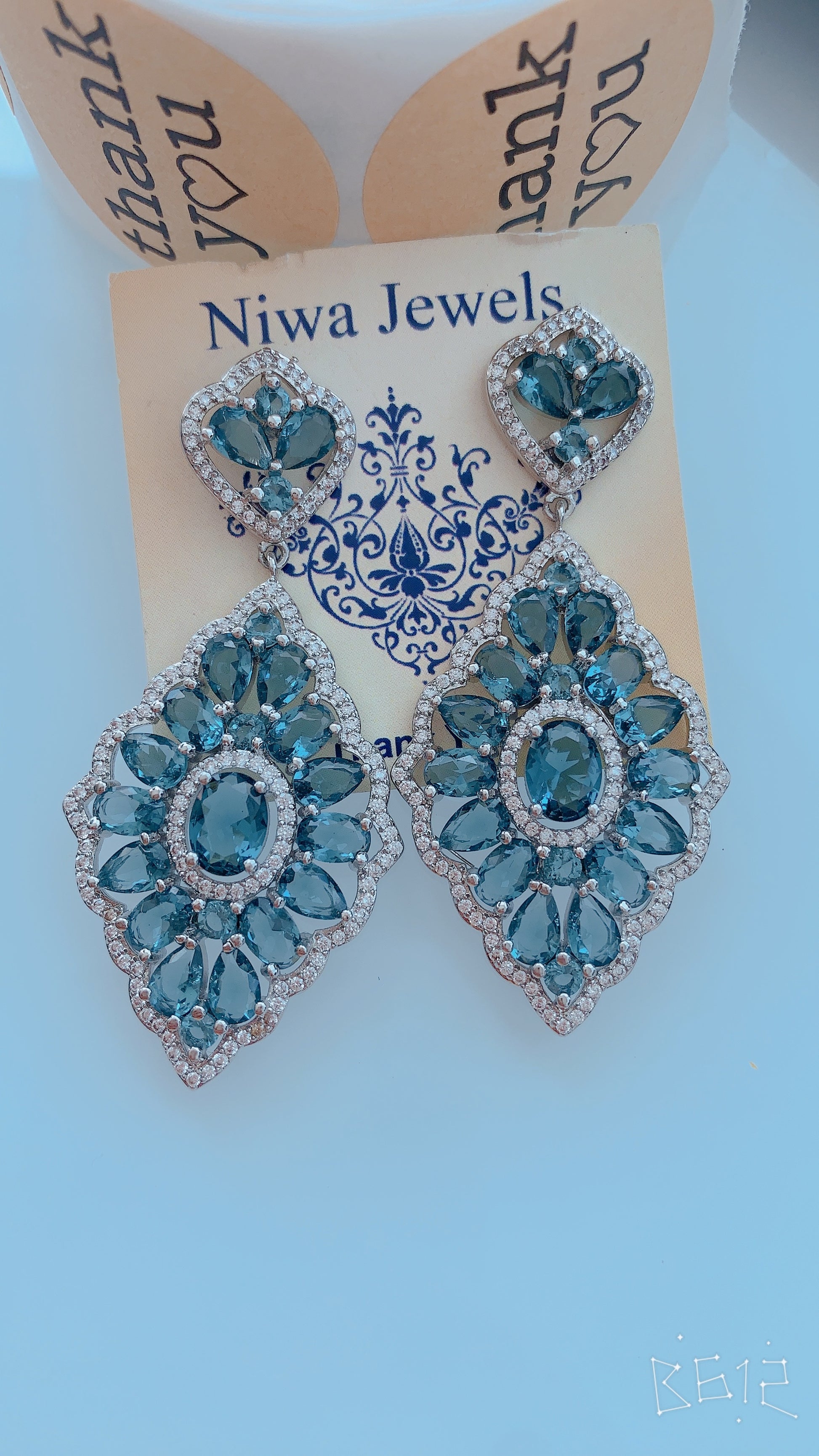 These dazzling statement earrings feature clusters of brilliant blue topaz gemstones framed by shimmering pavé cz AAA+ quality, set in silver. Designed in an ornate vintage-inspired silhouette, they deliver bold sparkle and timeless elegance—perfect for weddings, special occasions, or glamorous evenings out.