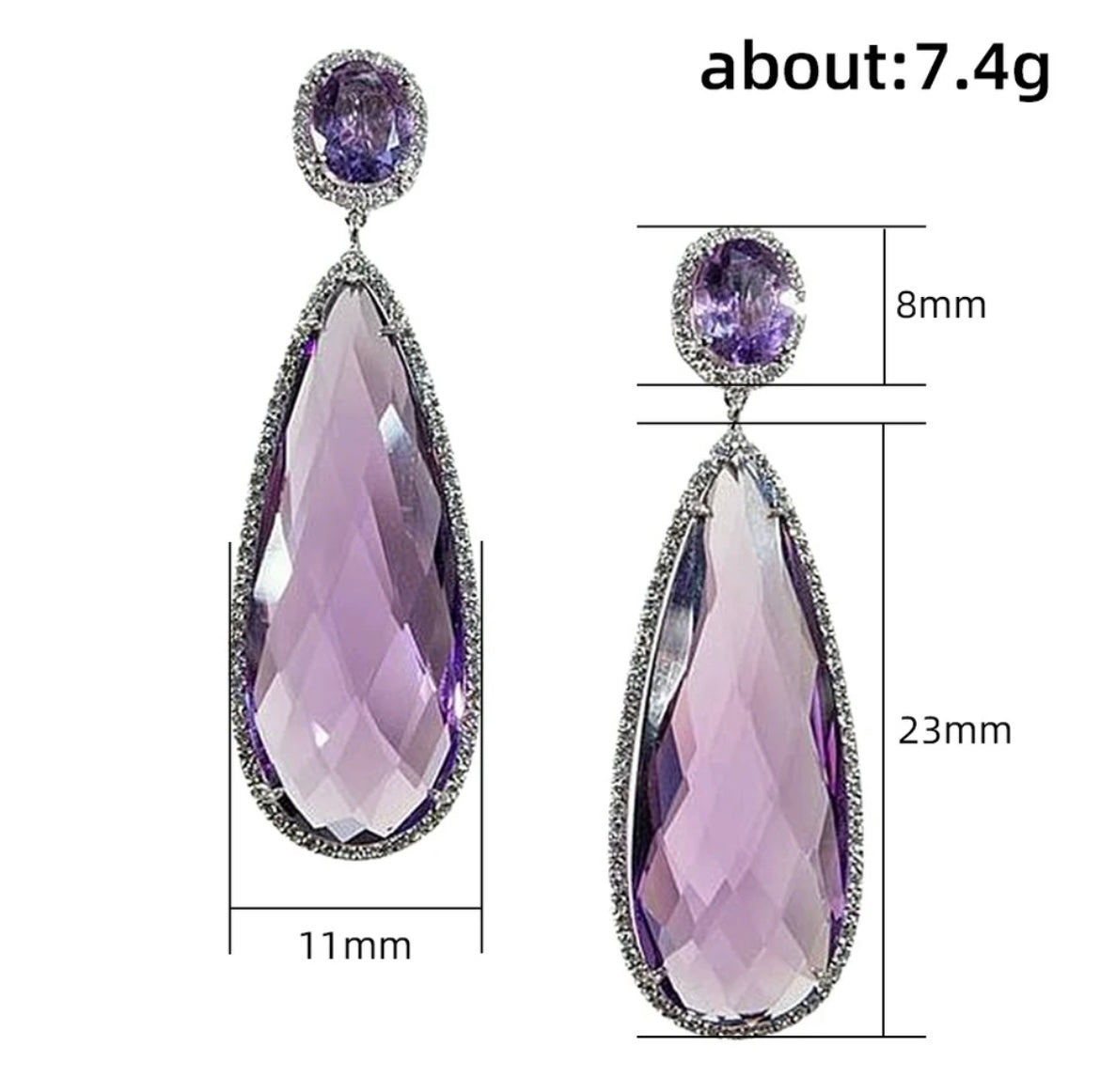 Make a graceful statement with these elongated teardrop earrings, showcasing faceted amethyst stones framed in shimmering pavé halos. A perfect blend of sophistication and sparkle.
