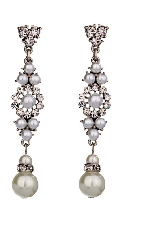 Elegant drop earrings featuring pearls and sparkling crystals, beautifully arranged in a floral-inspired design for timeless sophistication.