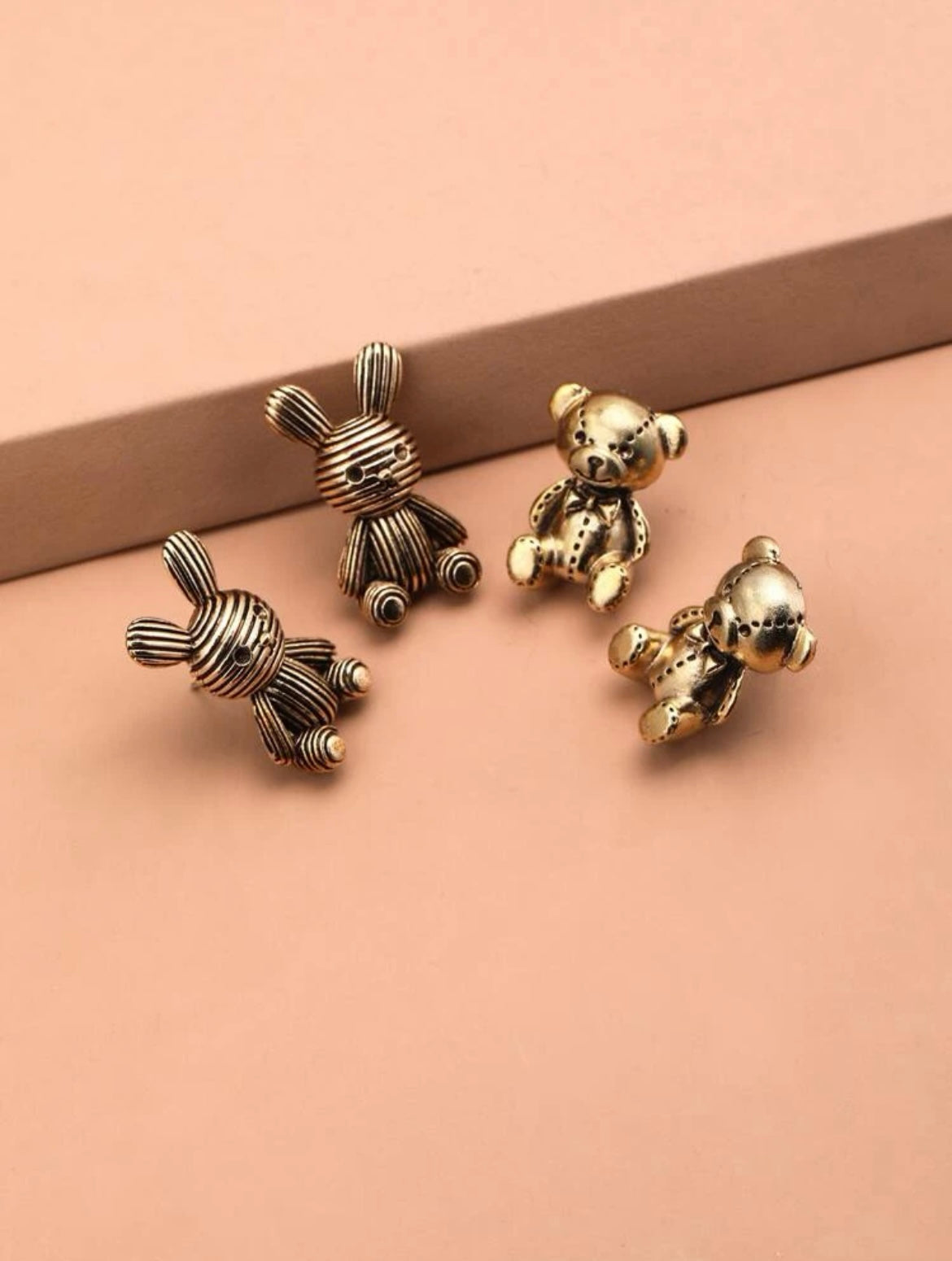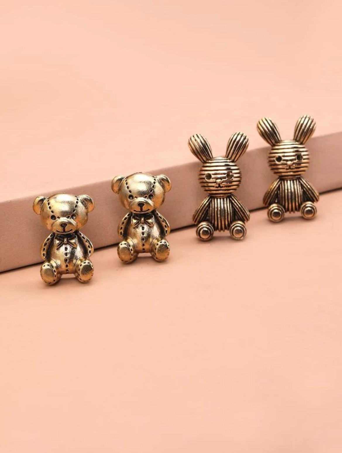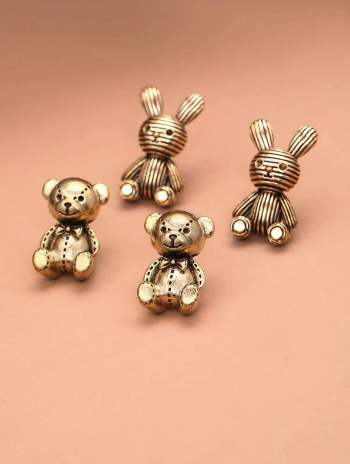 Charming metallic figurines of bears and rabbits in shiny finishes, delicately crafted for decorative or collectible appeal.