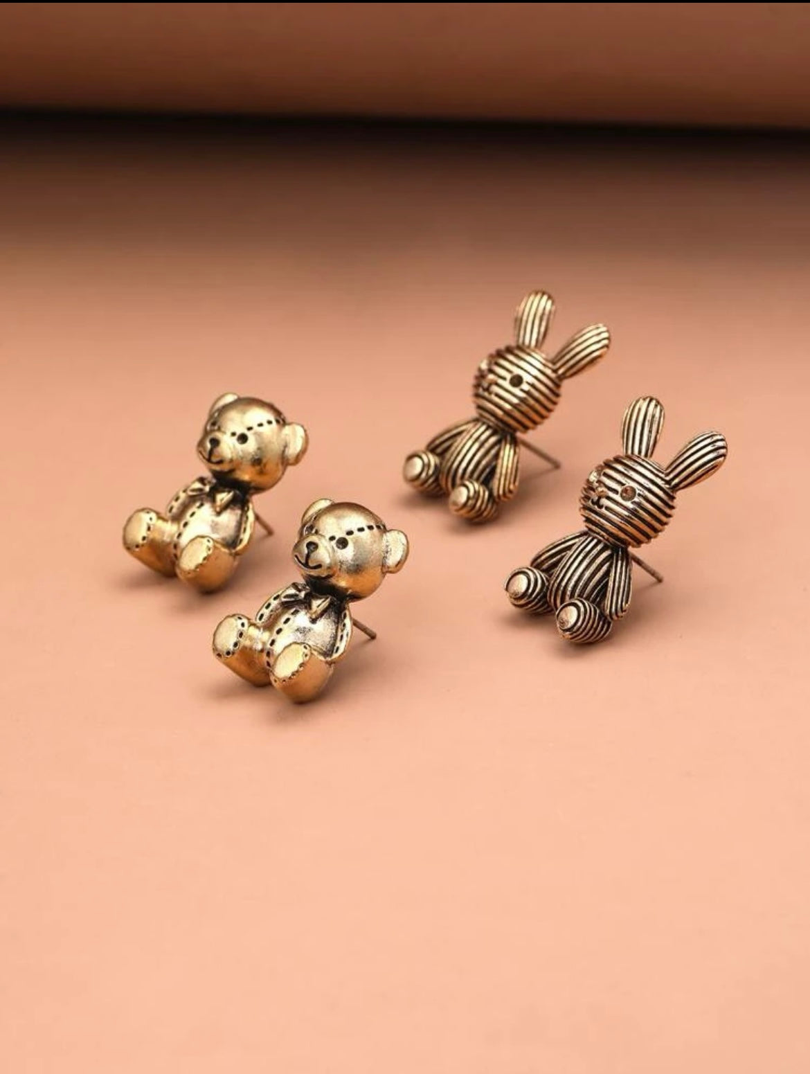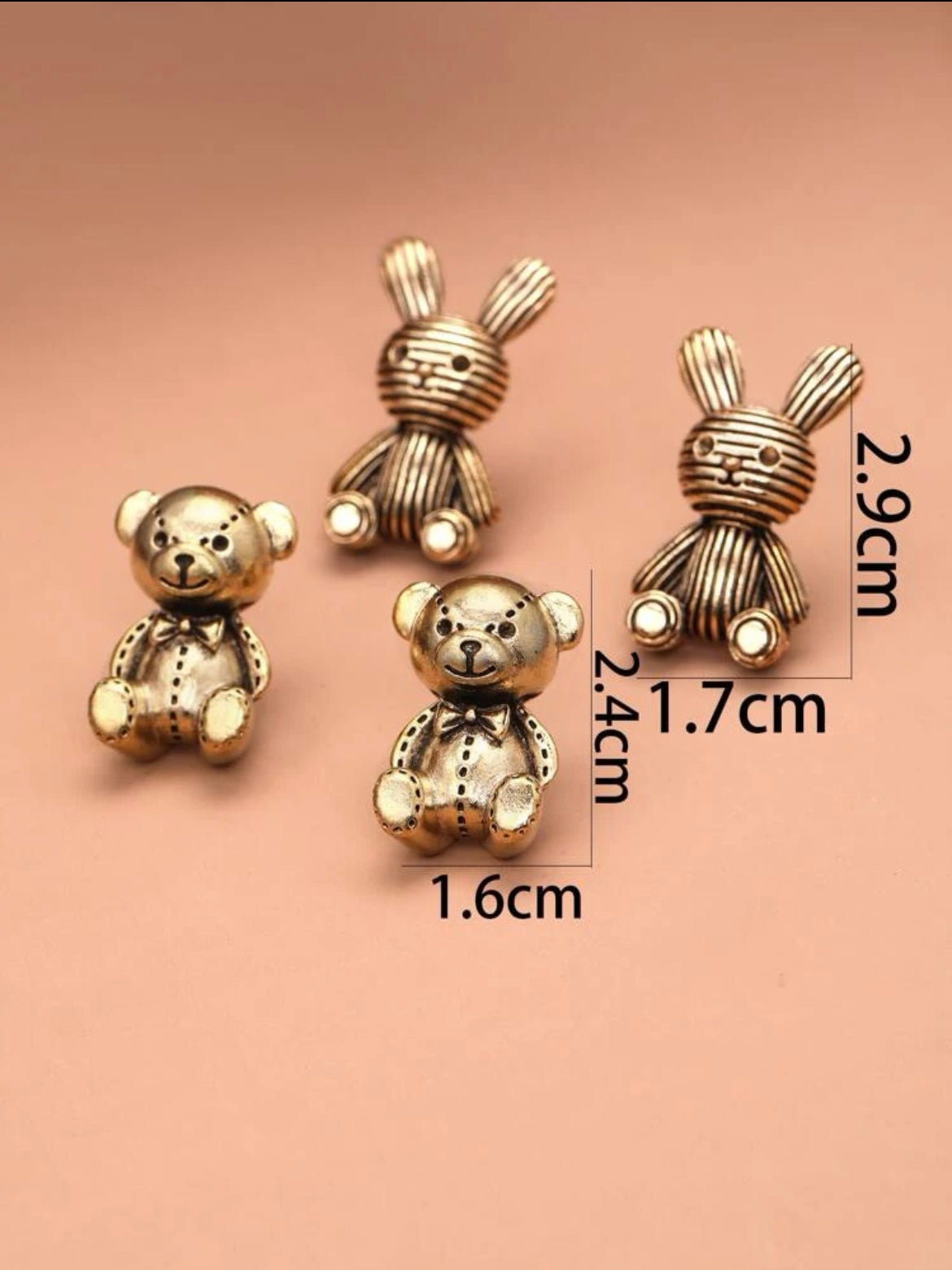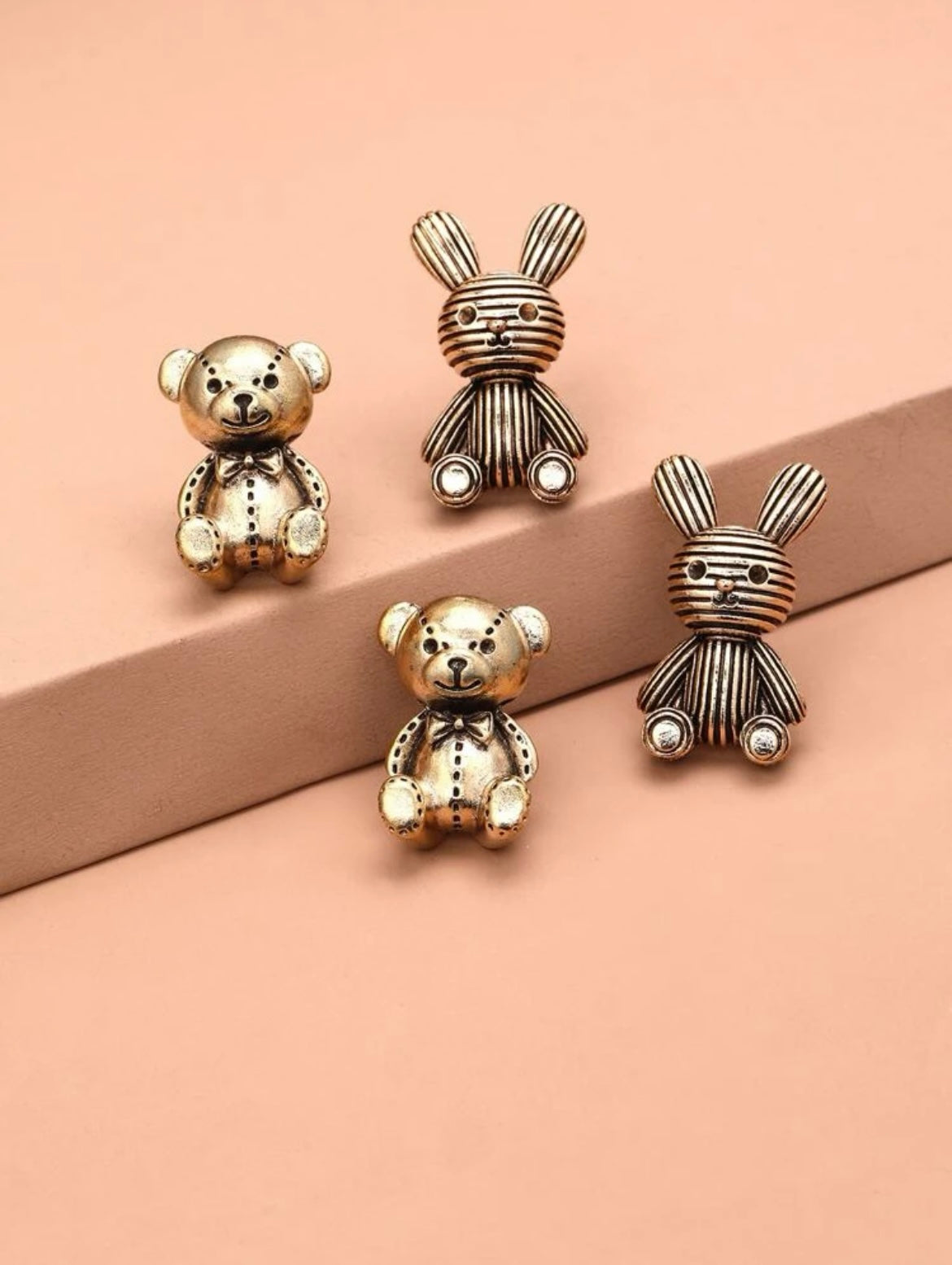 Charming metallic figurines of bears and rabbits in shiny finishes, delicately crafted for decorative or collectible appeal.
