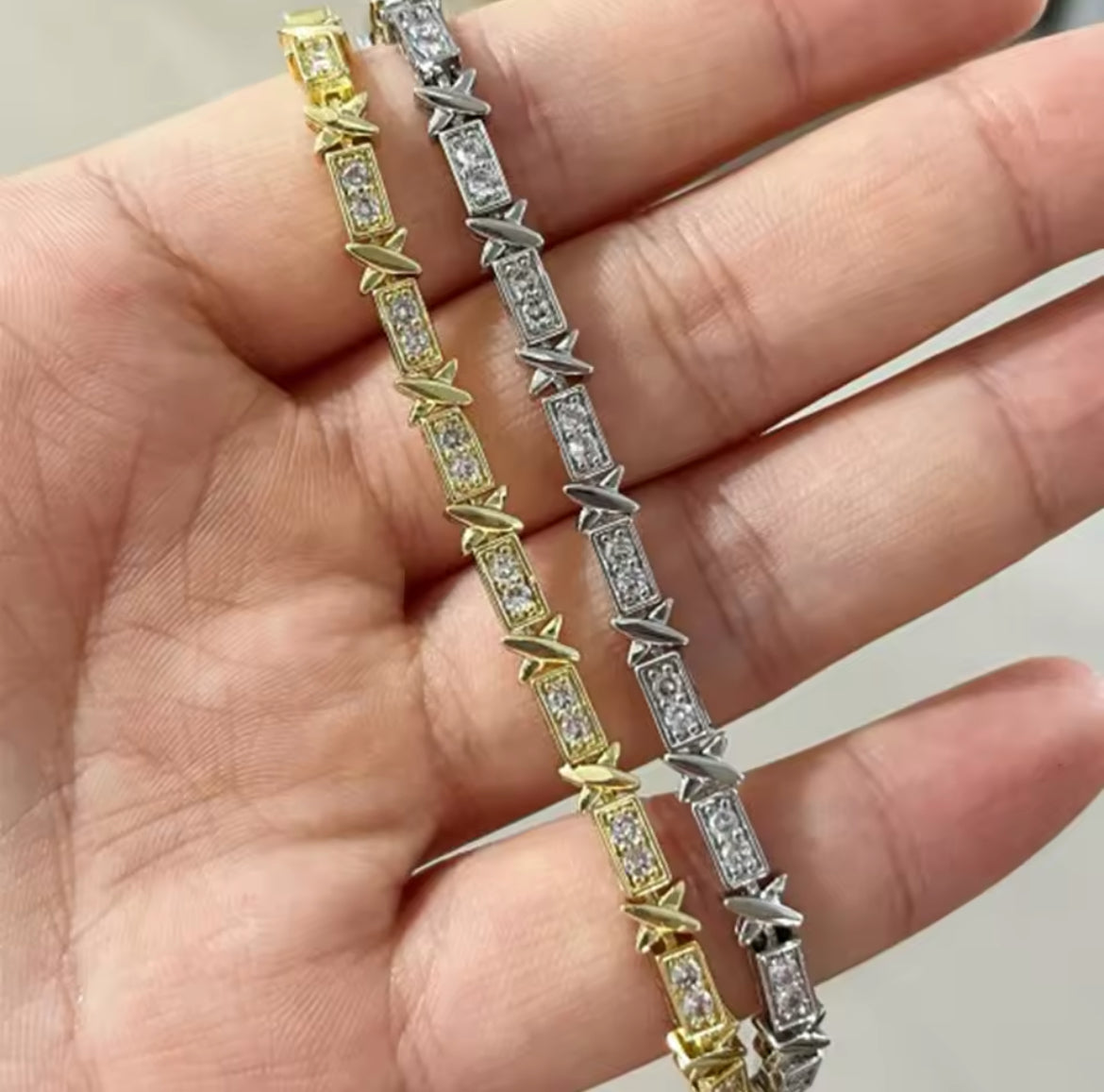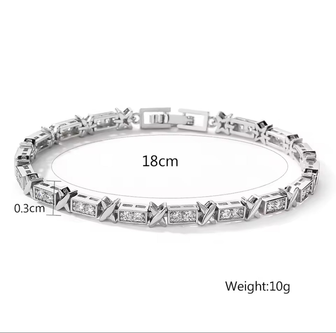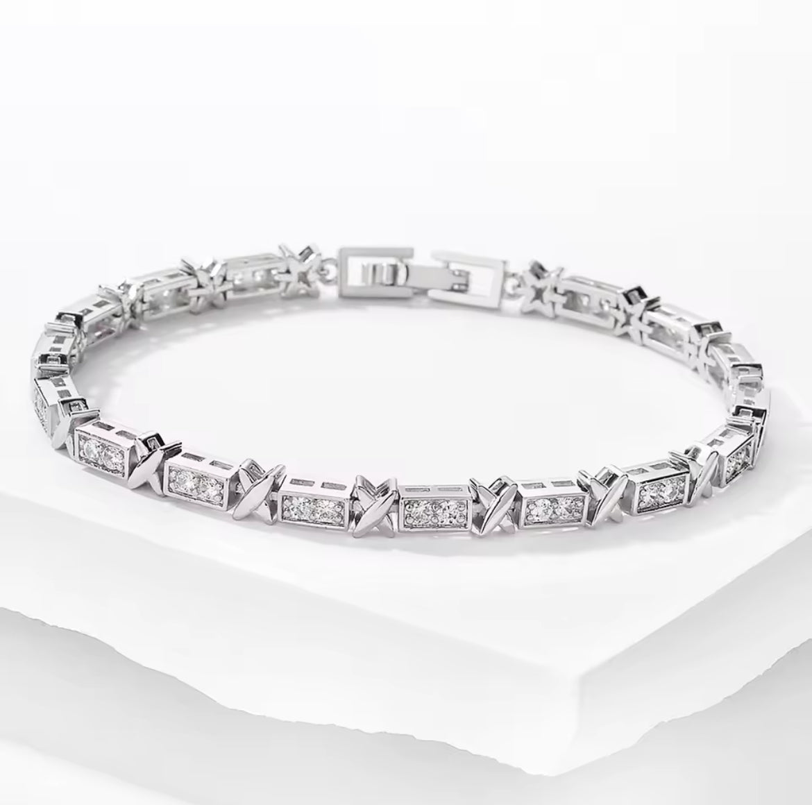 This bracelets made of small, links that resemble an "X" shape, shiny appearance, elegant design.